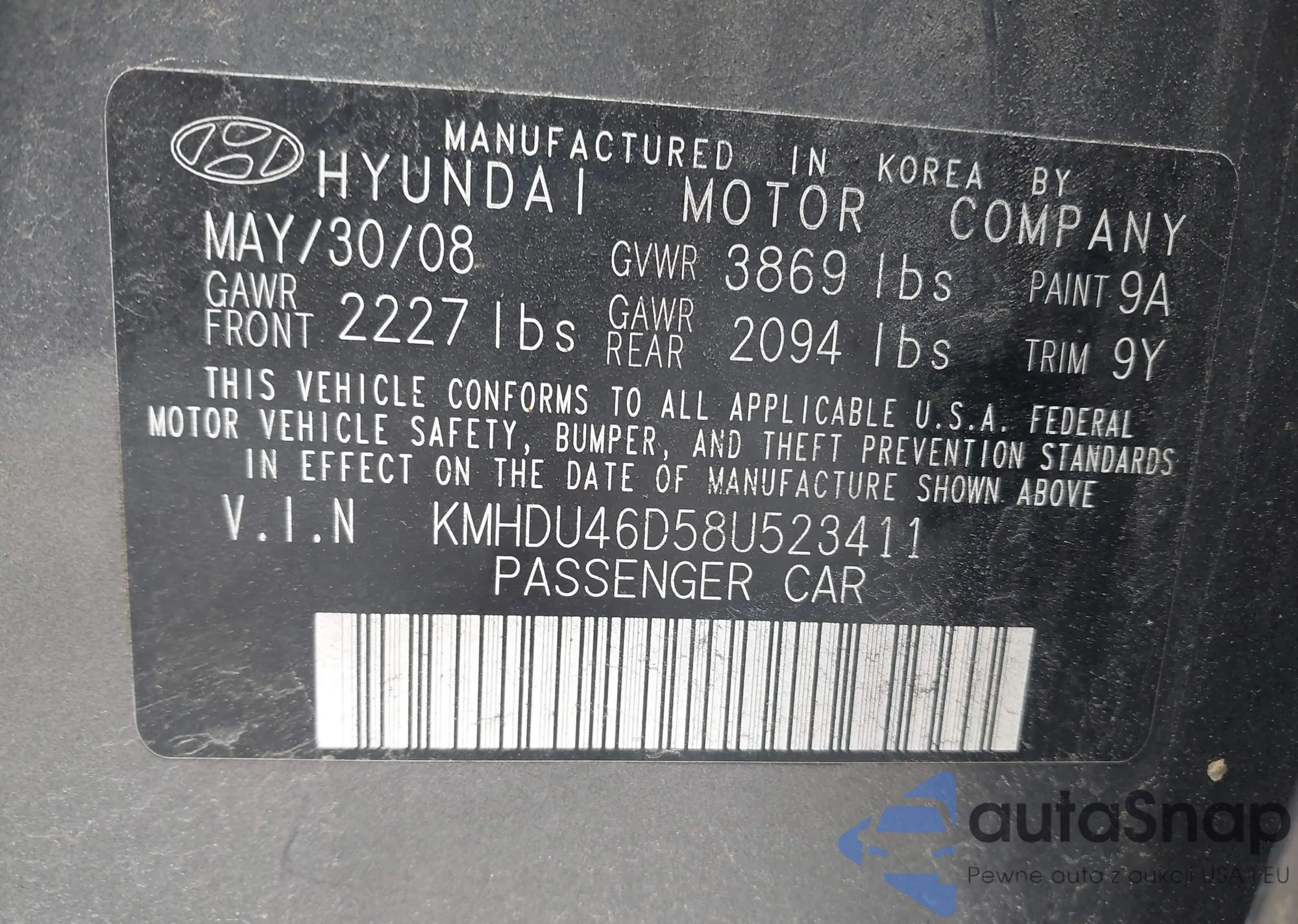 LOT: 42376103 VIN: KMHDU46D58U523411
