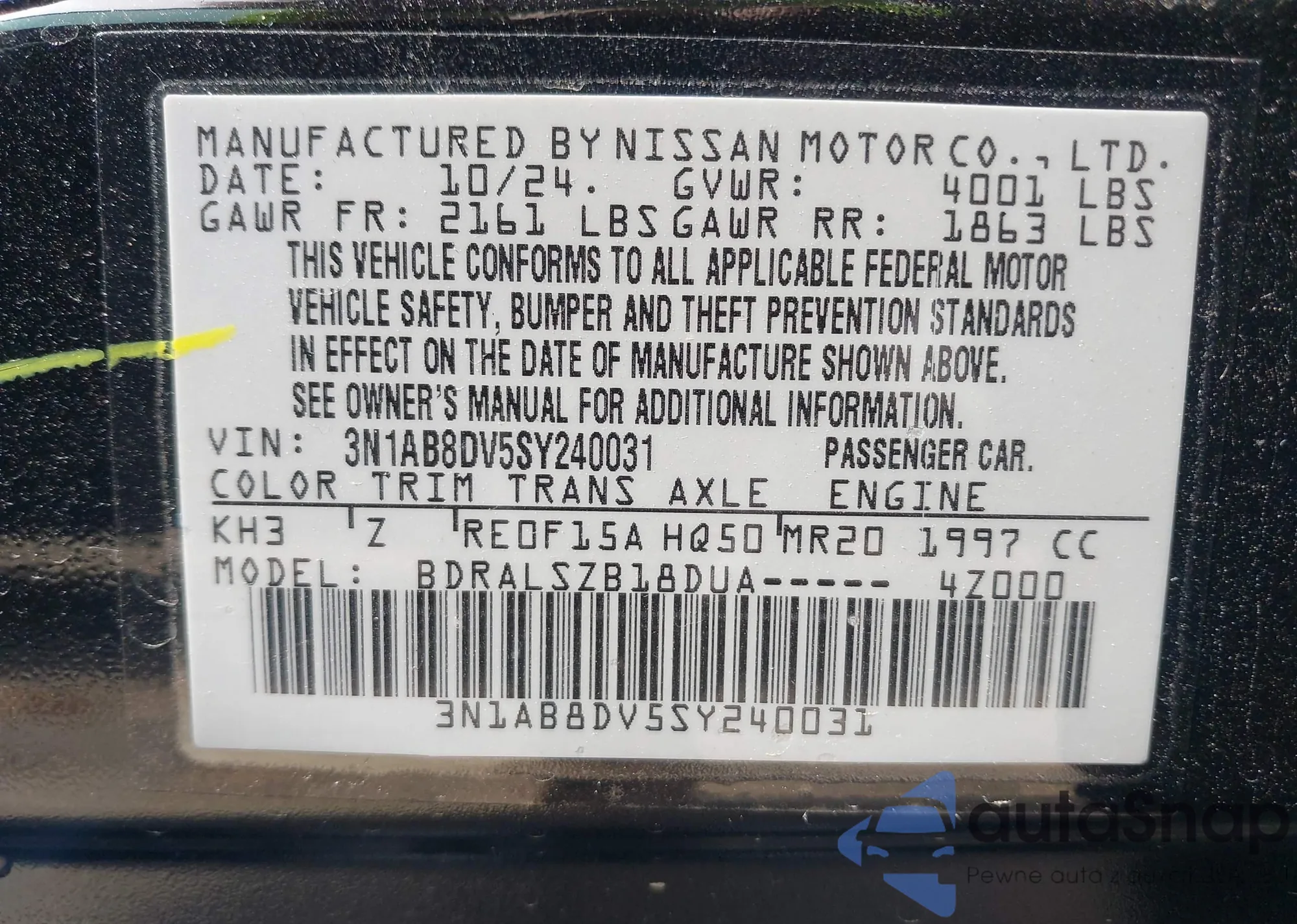 • VIN 3N1AB8DV5SY240031