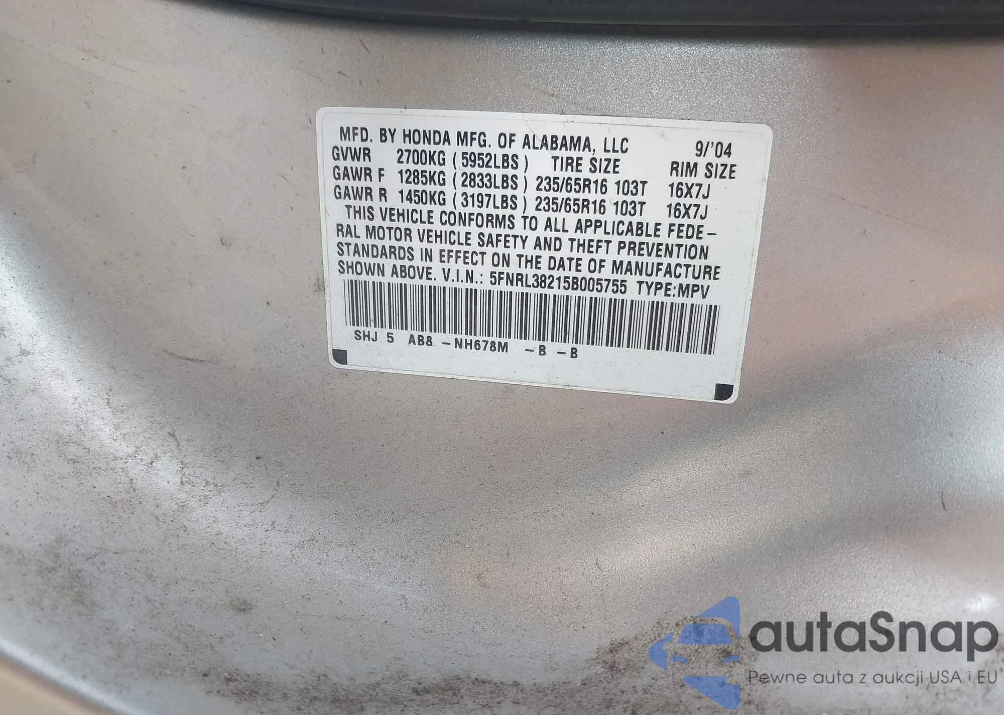 LOT: 42198320 VIN: 5FNRL6H71KB081808