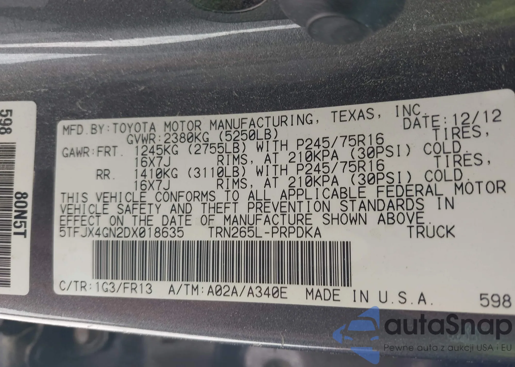 • VIN 5TFJX4GN2DX018635