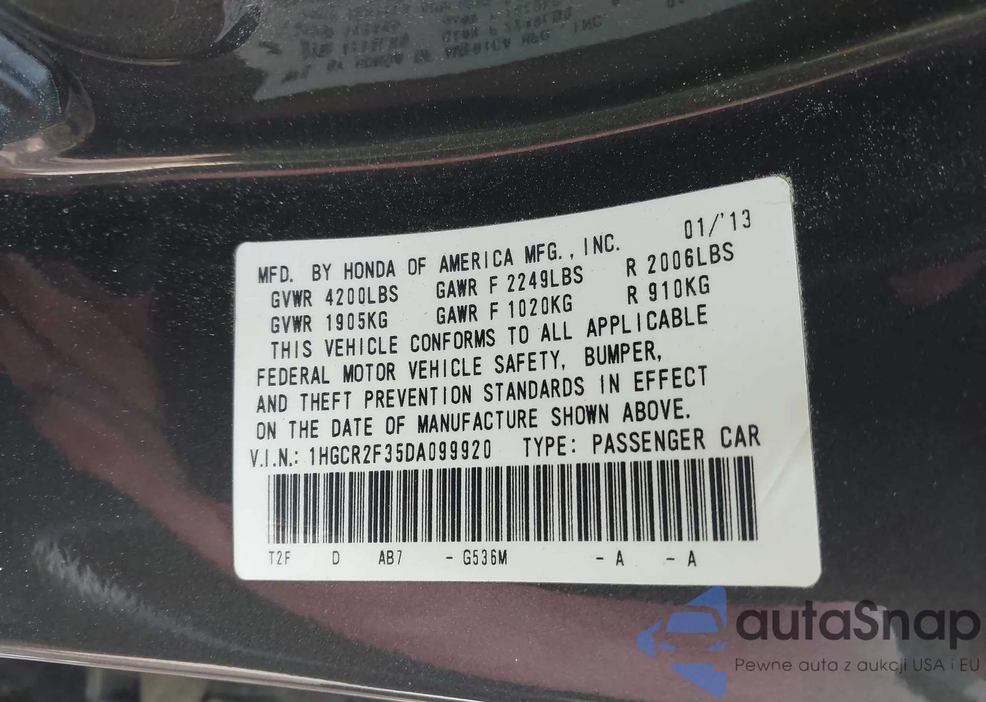 LOT: 42419339 VIN: 1HGCR2F35DA099920
