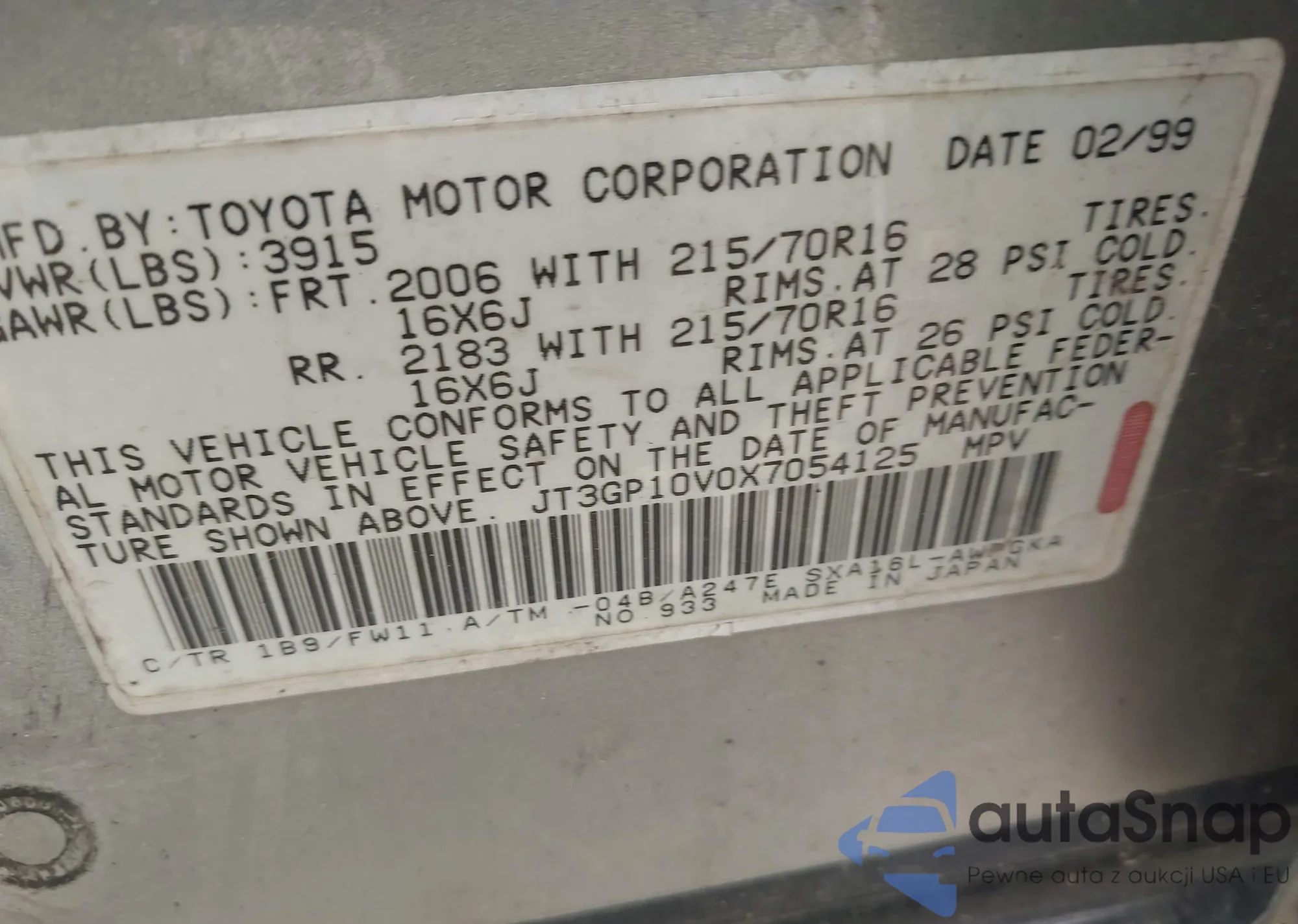 LOT: 42281091 VIN: 2T3RFREV8GW450273