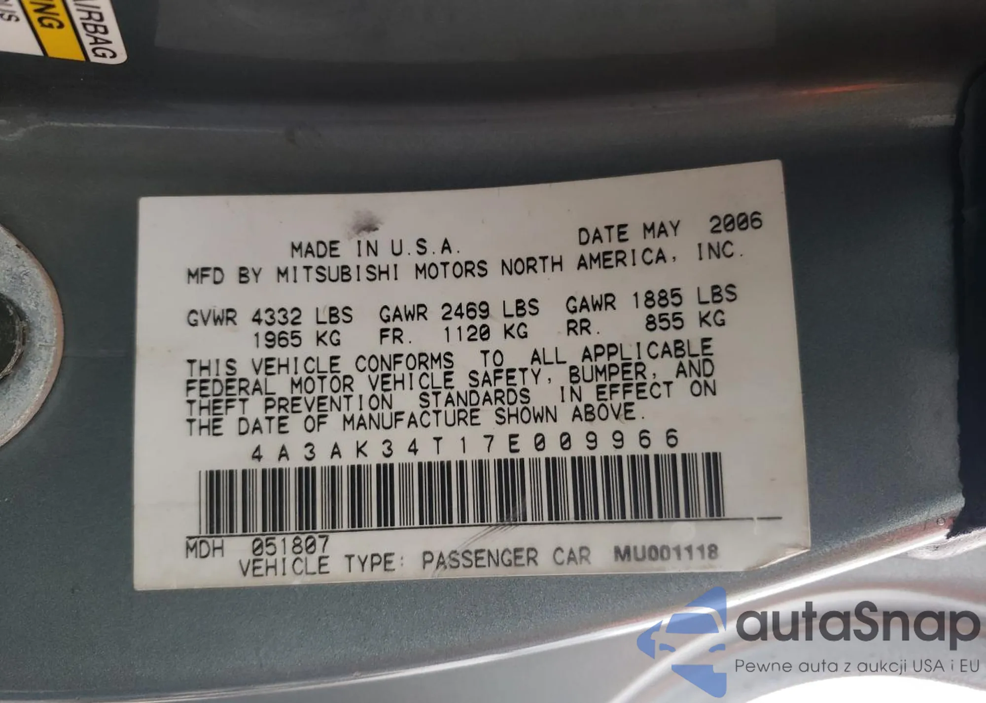 • VIN 4A3AK34T17E009966