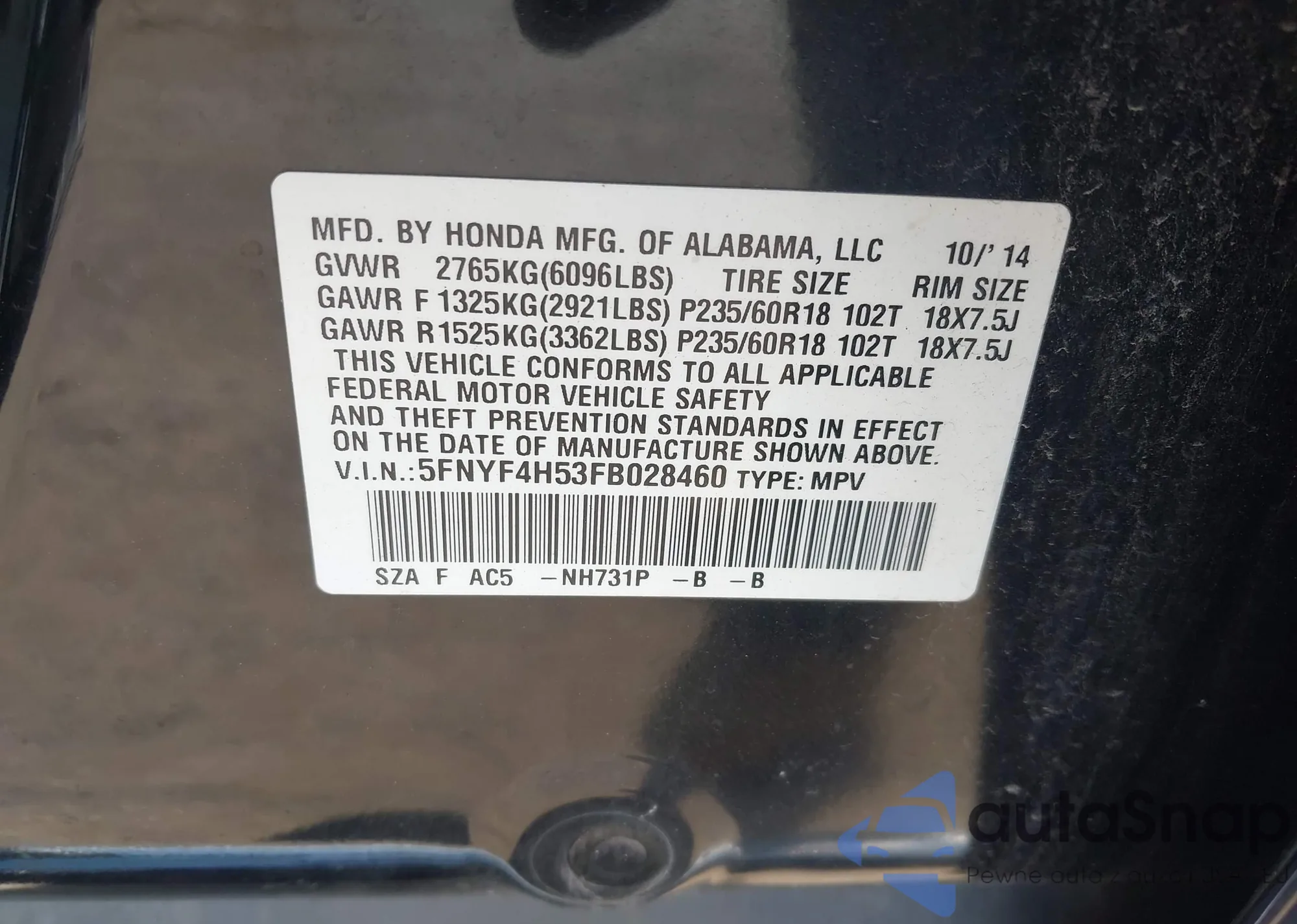 • VIN 5FNYF4H53FB028460