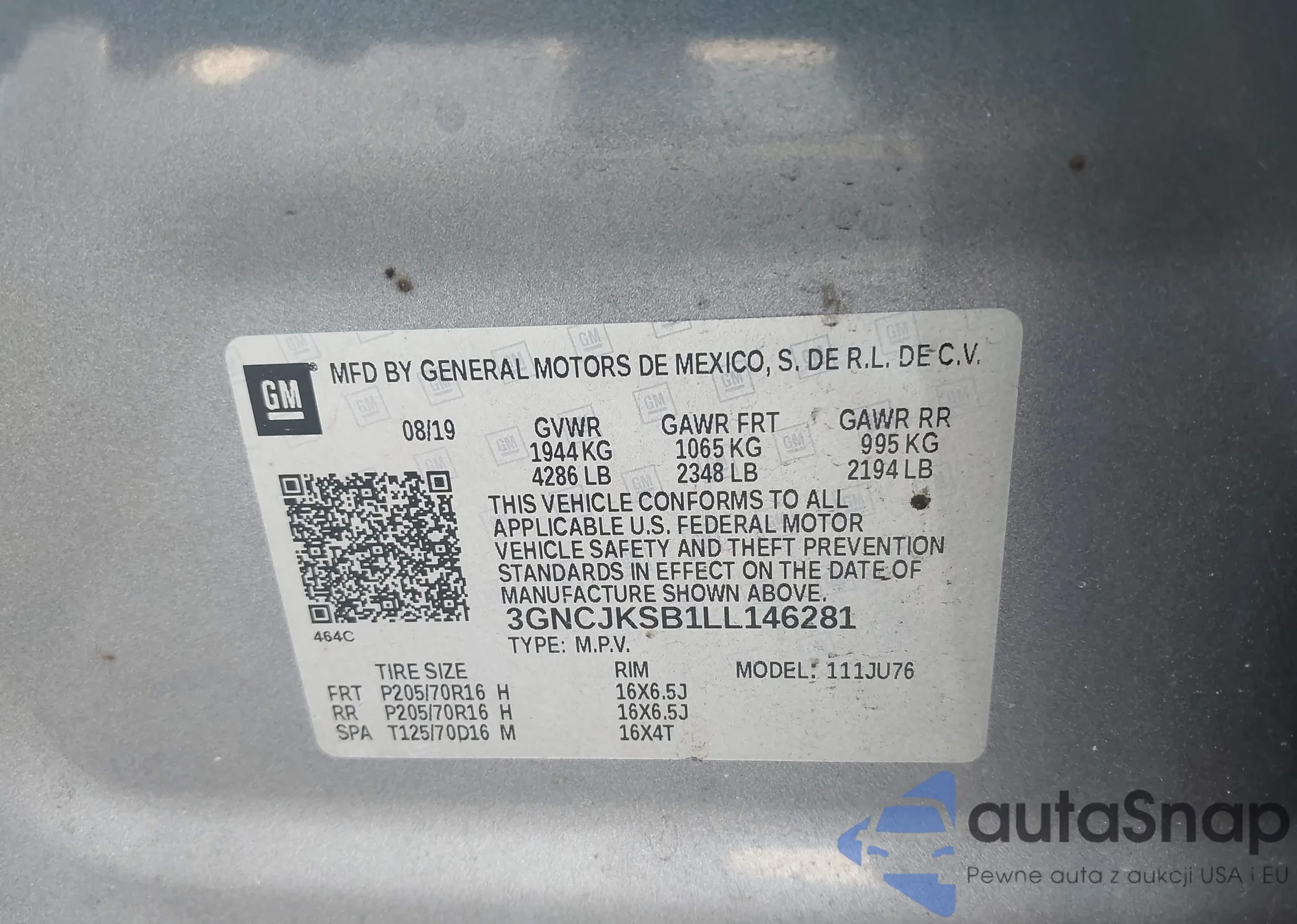 • VIN 3GNCJKSB1LL146281