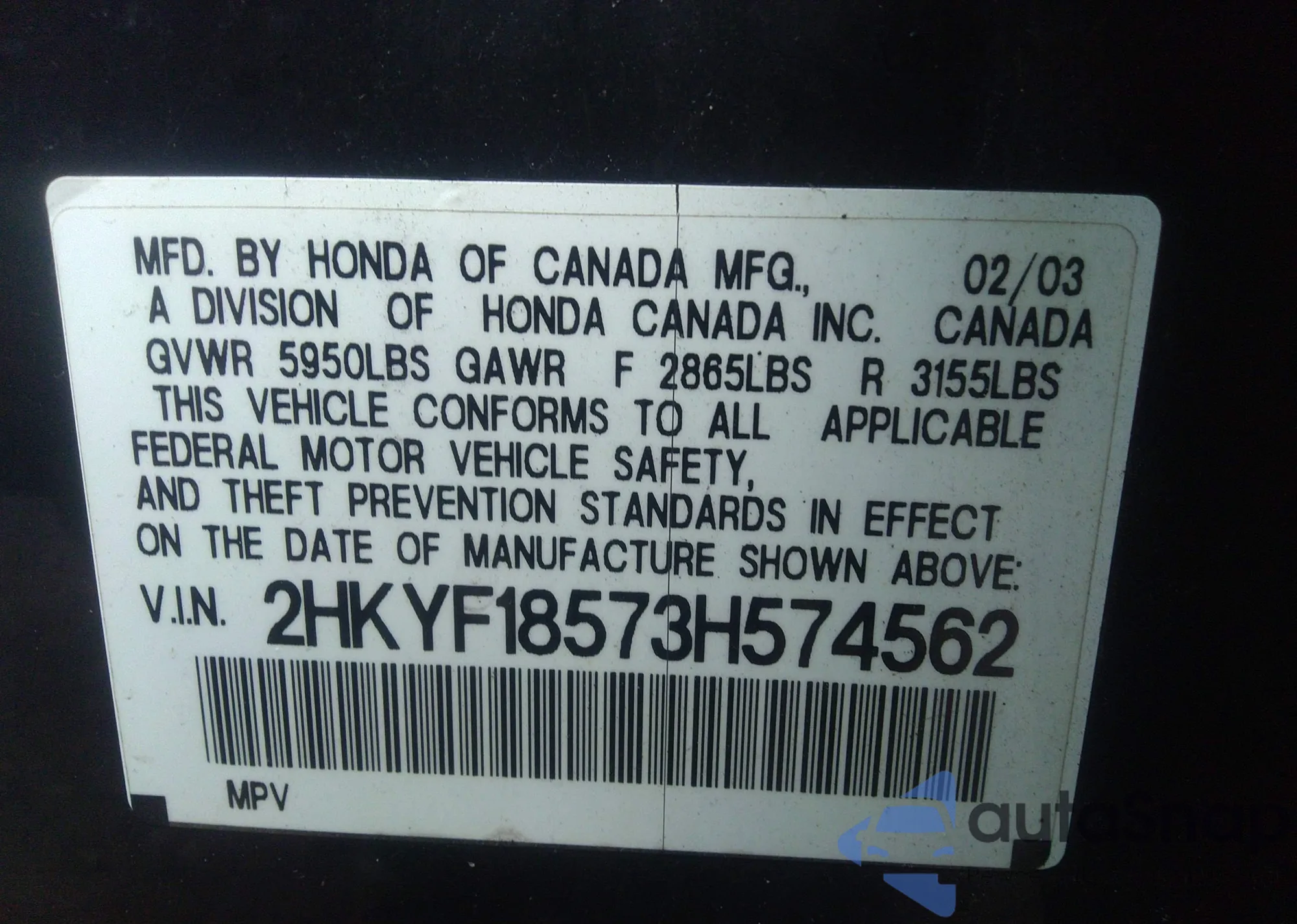 • VIN 2HKYF18573H574562