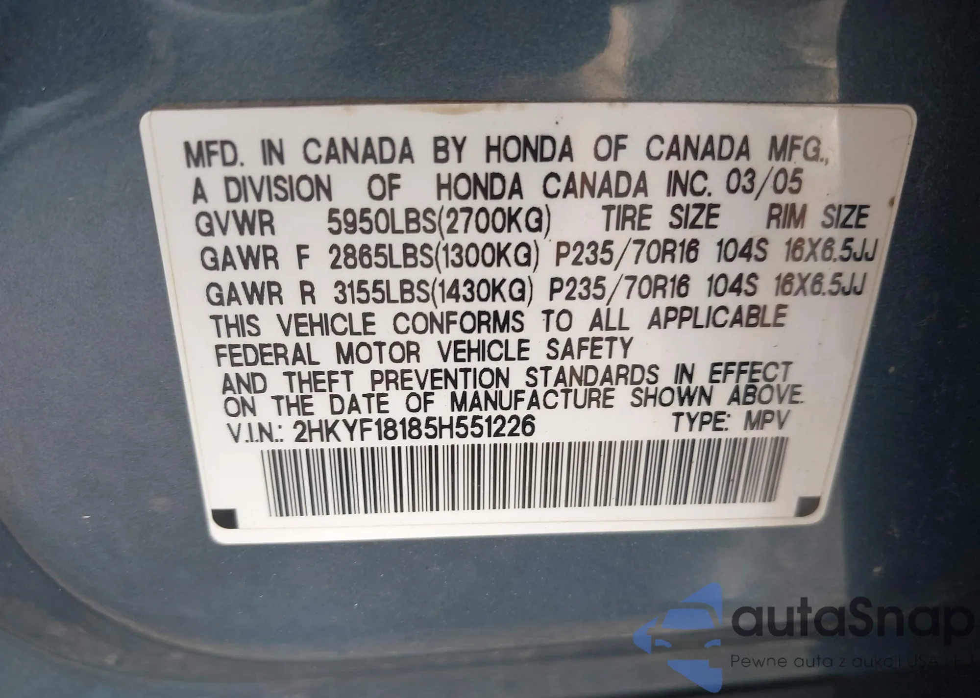 LOT: 43046785 VIN: 2HKYF18185H551226