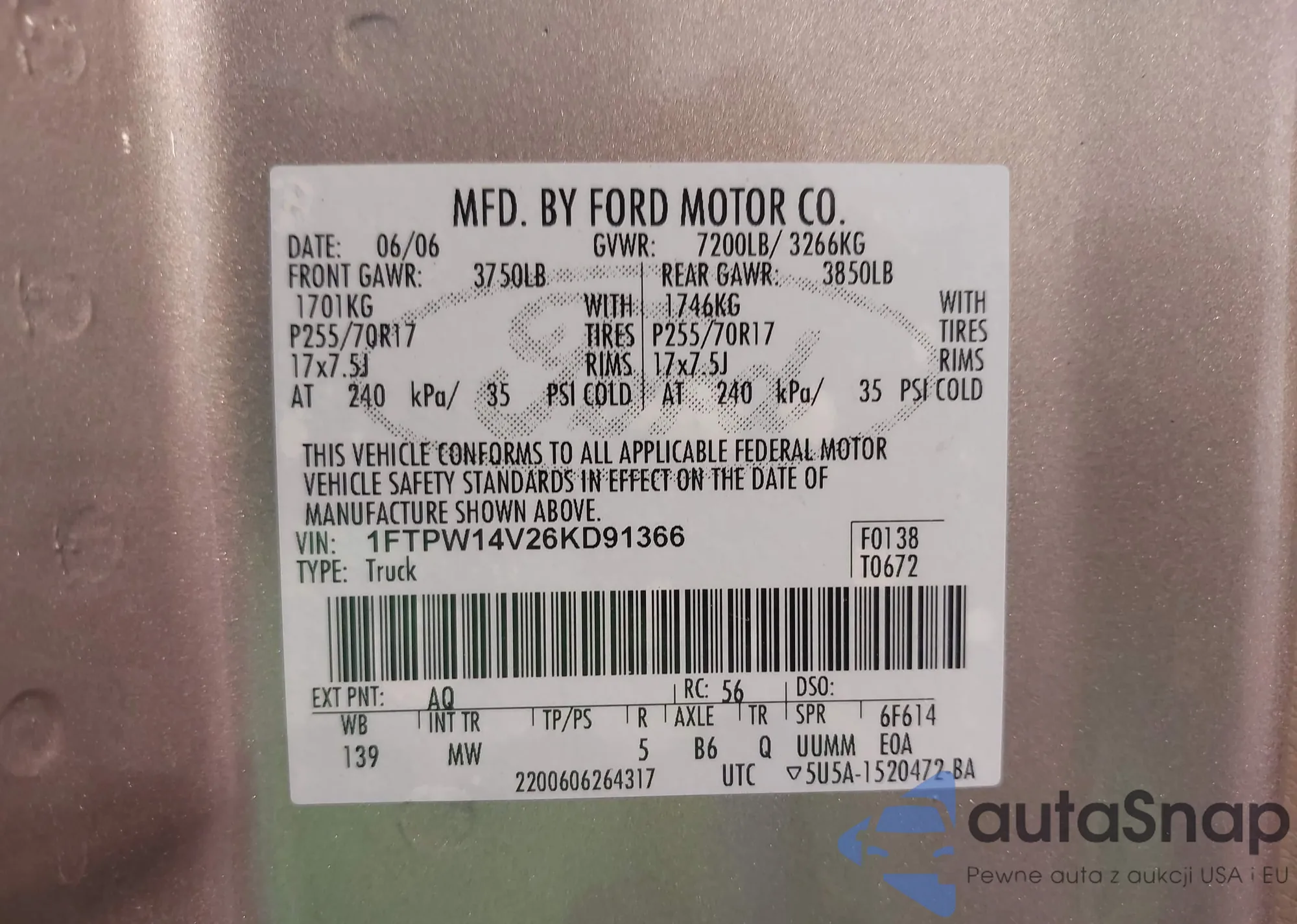 • VIN 1FTPW14V26KD91366