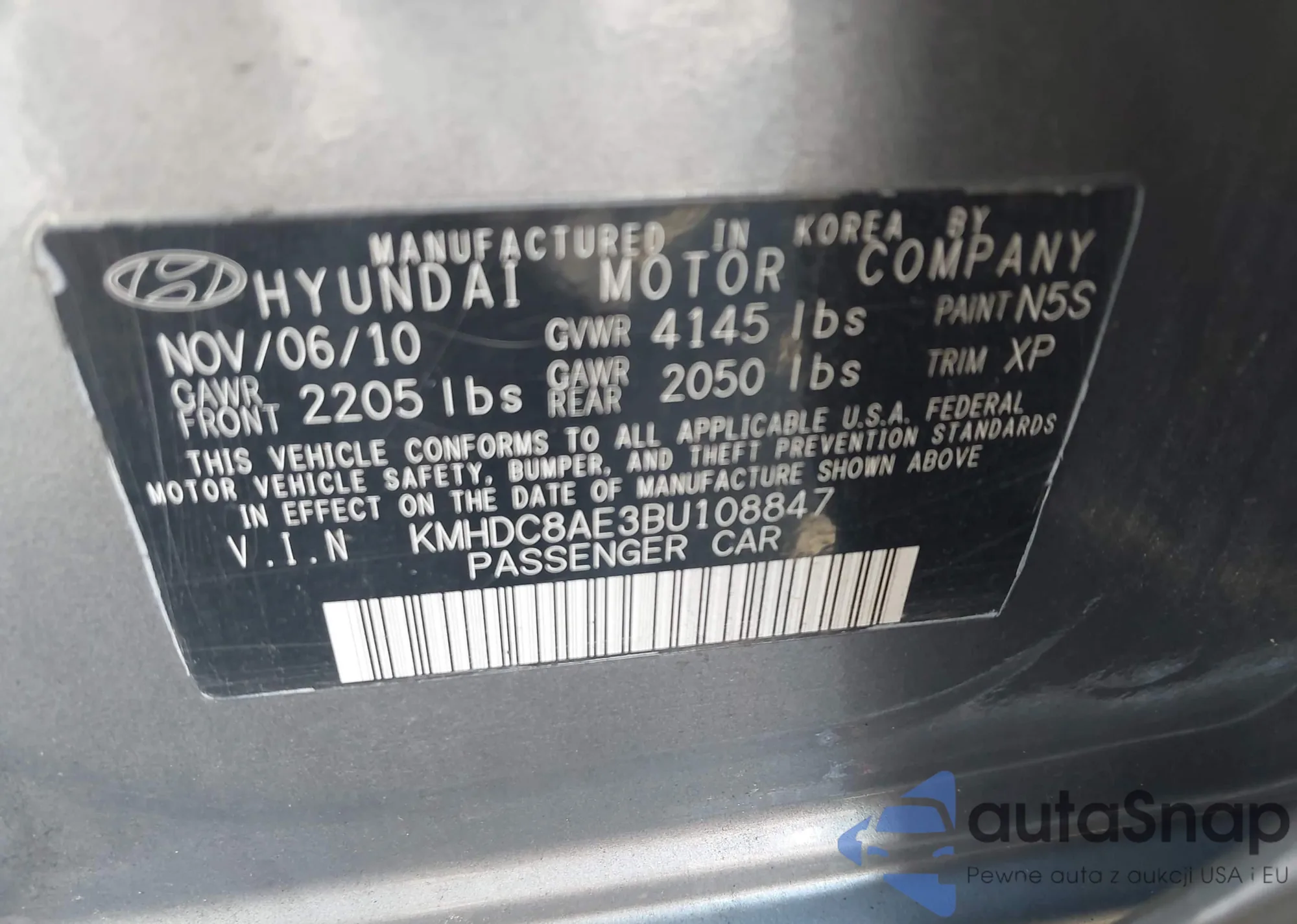 LOT: 43231950 VIN: KMHDC8AE3BU108847