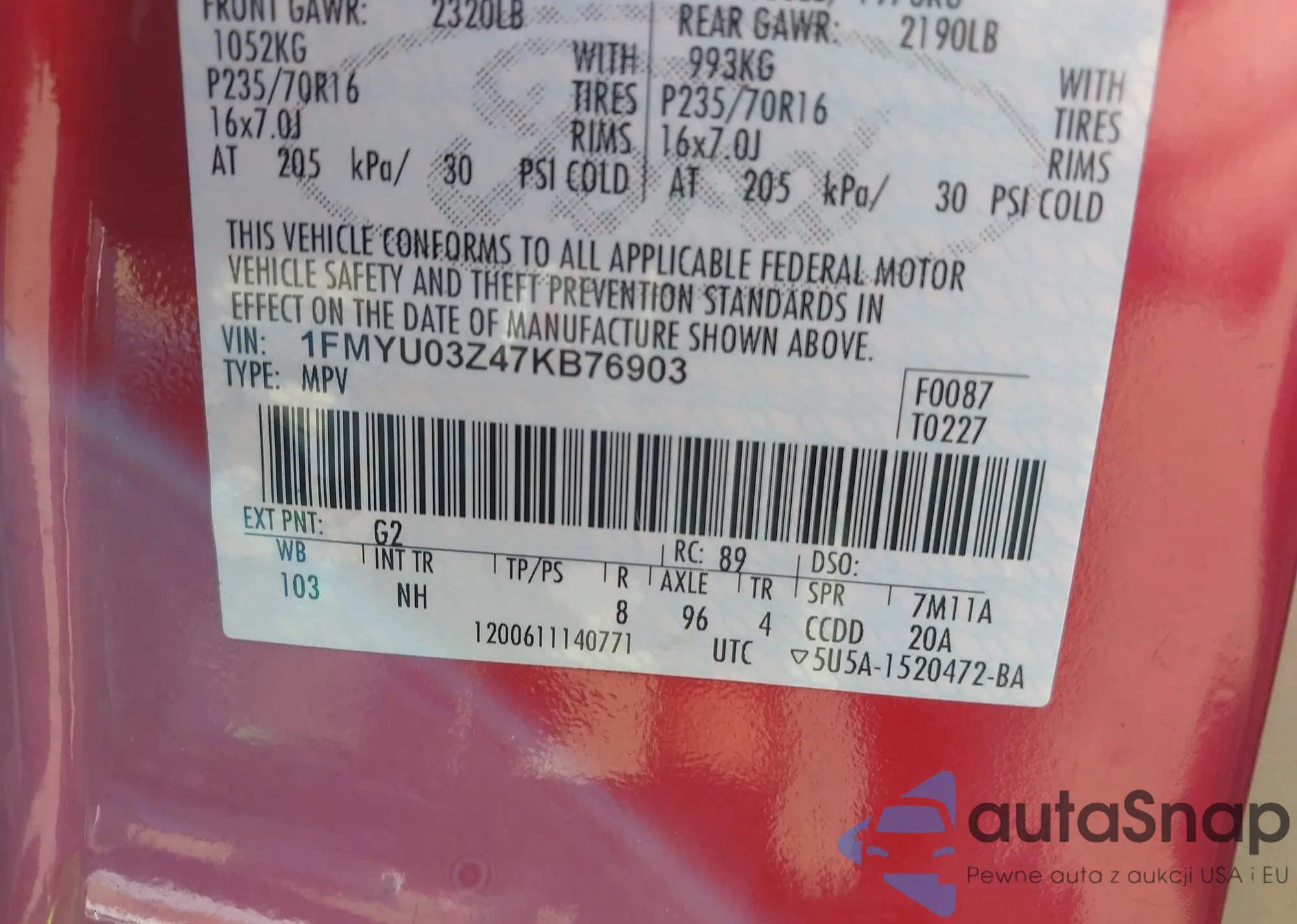 LOT: 43135976 VIN: 1FMYU03Z47KB76903