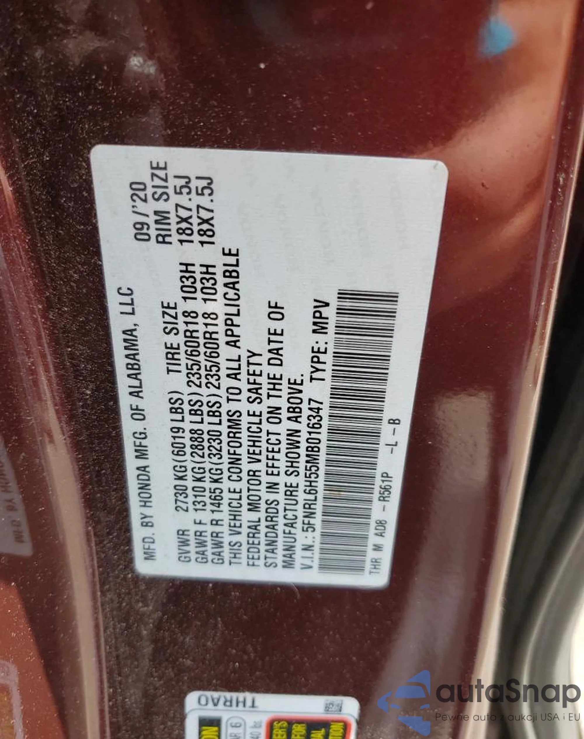 • VIN 5FNRL6H55MB016347