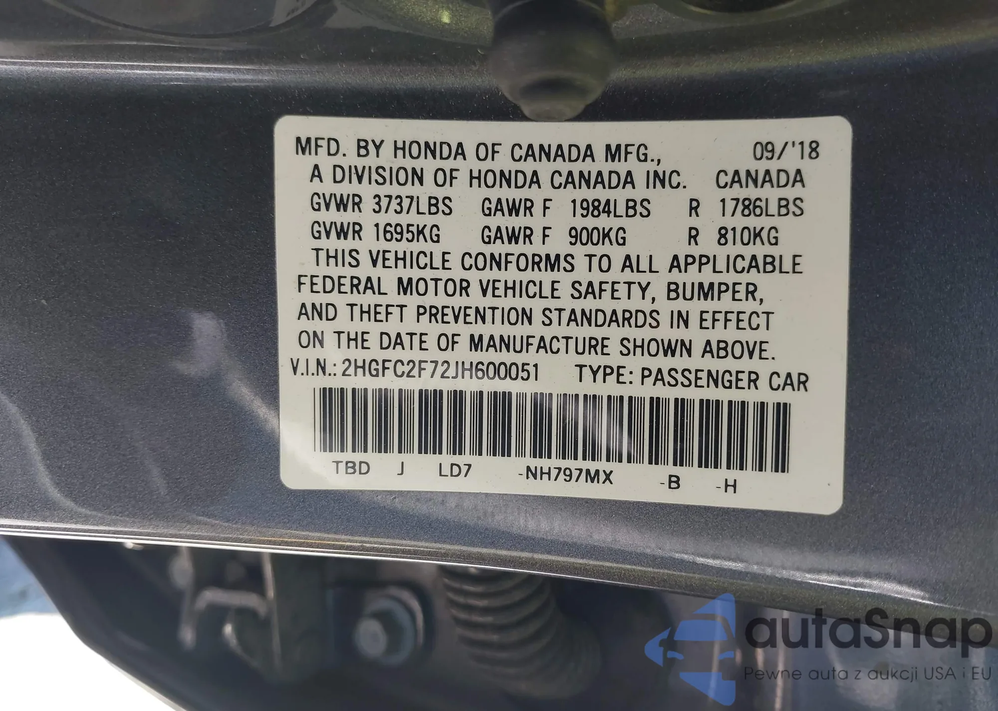 LOT: 43240564 VIN: 2HGFC2F5XHH566806