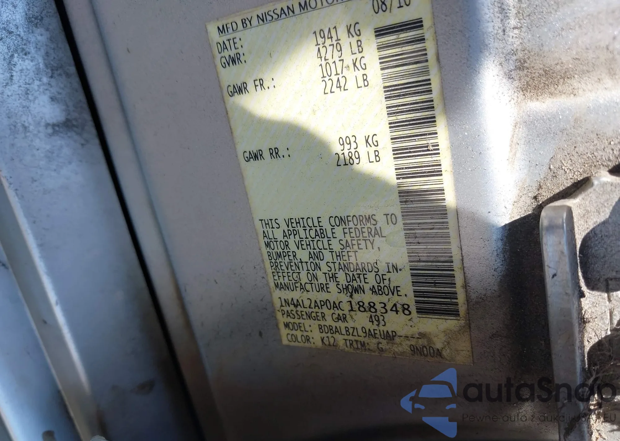 LOT: 43211600 VIN: 1N4AL2AP0AC188348