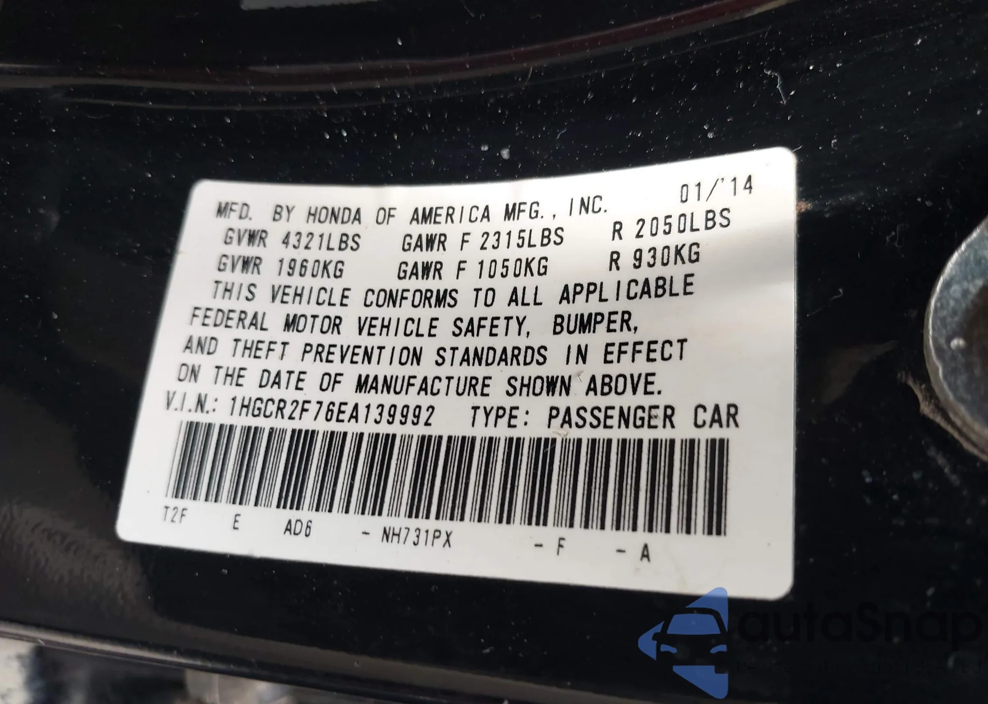 LOT: 42658732 VIN: 1HGCR2F76EA139992