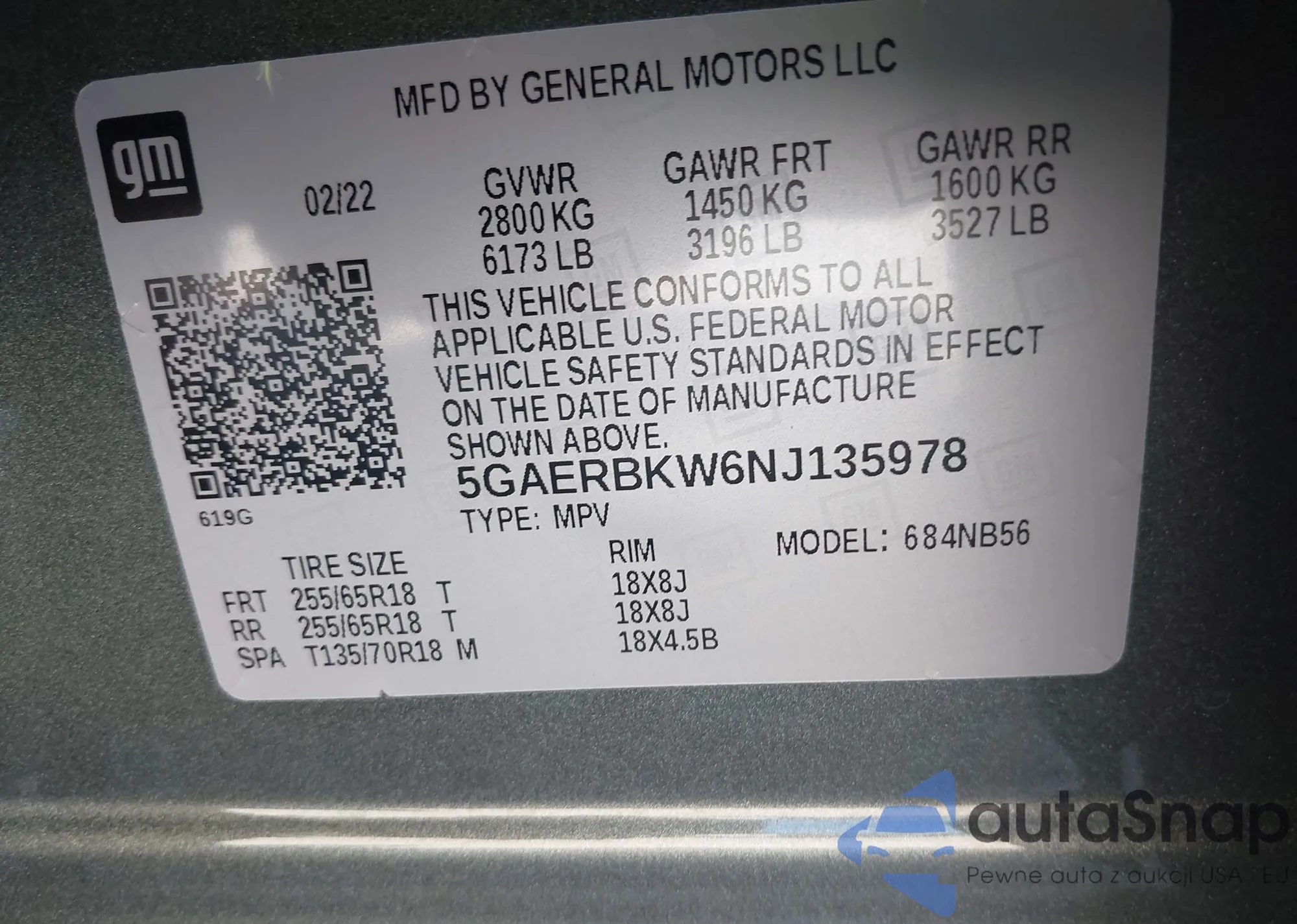 LOT: 43126378 VIN: 5GAERBKW6NJ135978