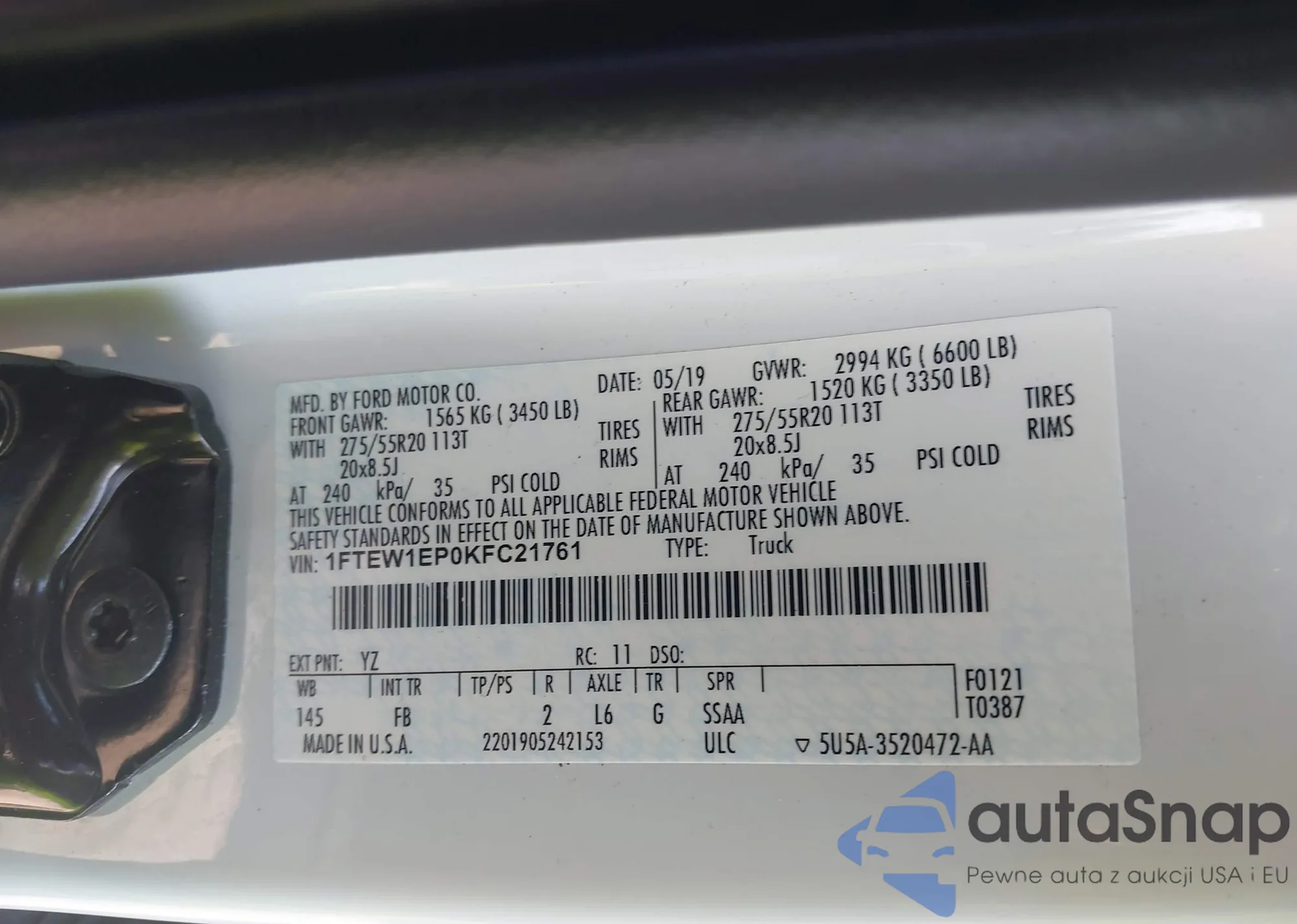 LOT: 43267497 VIN: 1FTEW1EP0KFC21761