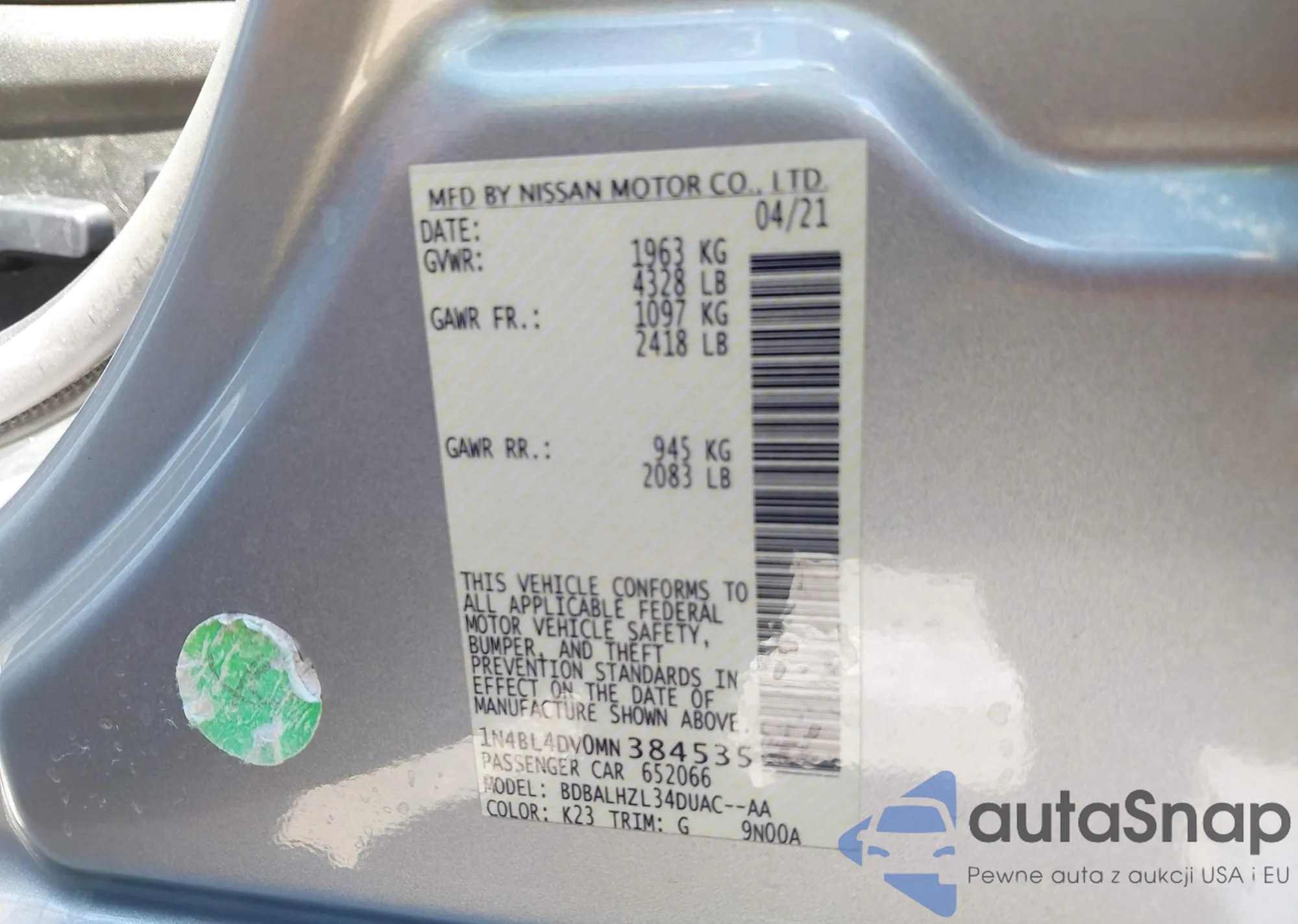 LOT: 42841219 VIN: 1N4BL4DV0MN384535