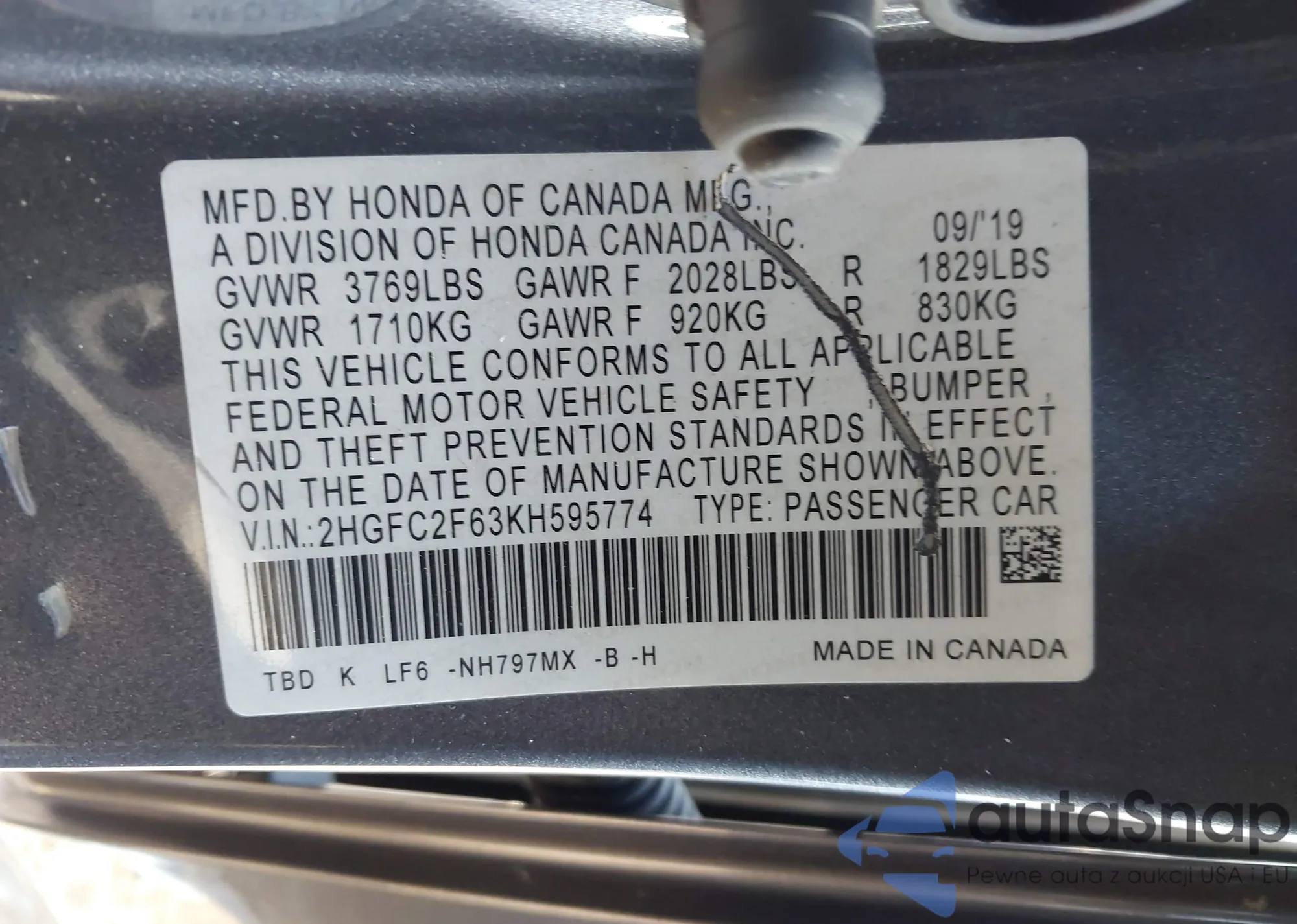 • VIN 2HGFC2F63KH595774