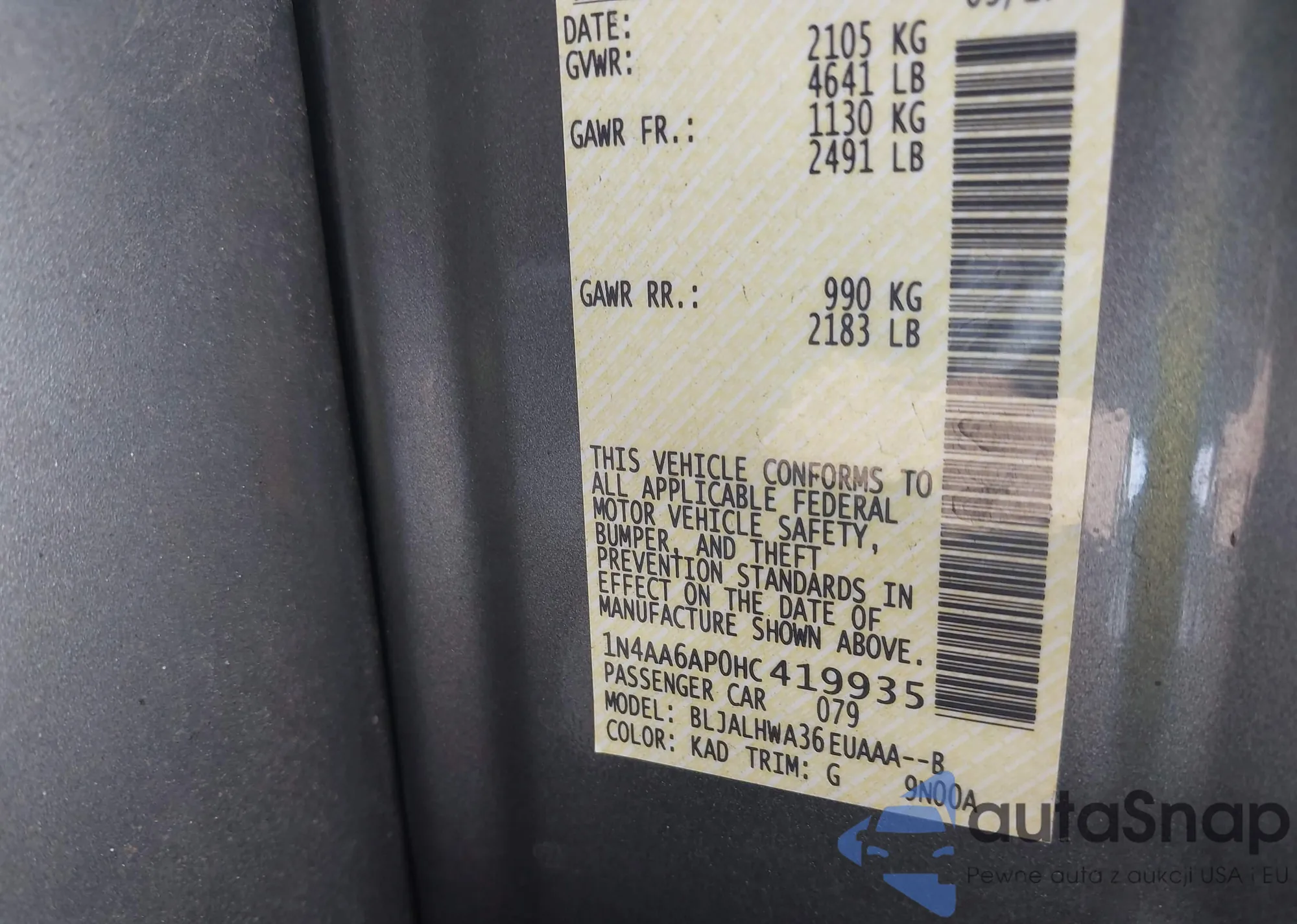 • VIN 1N4AA6AP0HC419935