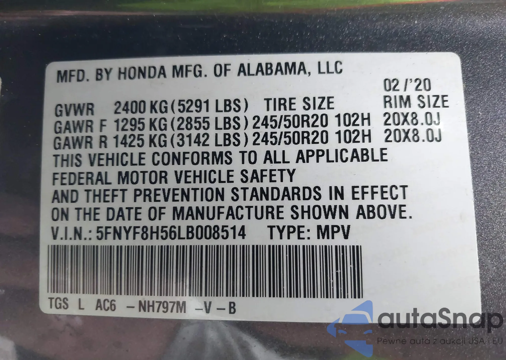 LOT: 42948427 VIN: 5FNYF8H56LB008514