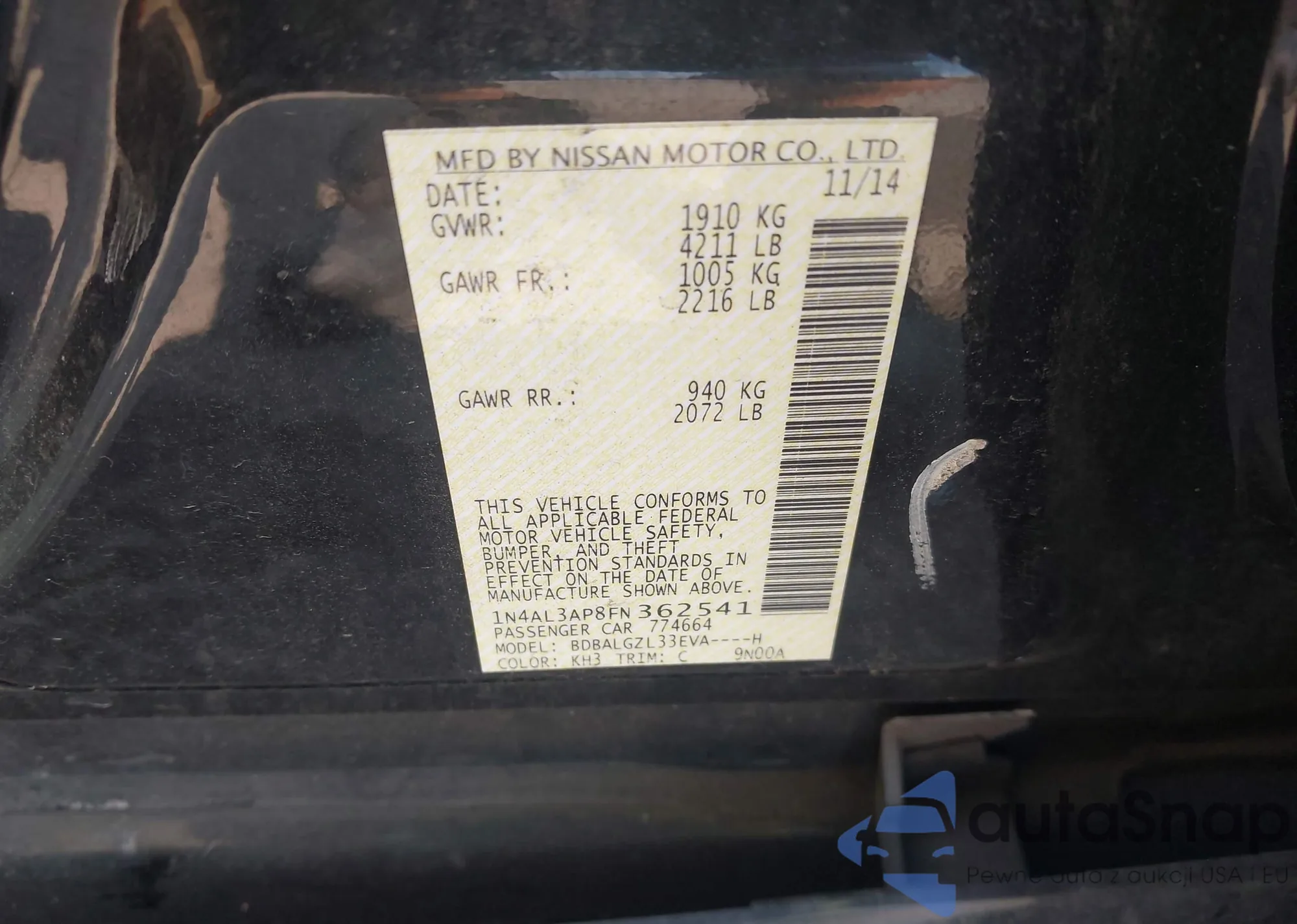 • VIN 1N4AL3AP8FN362541