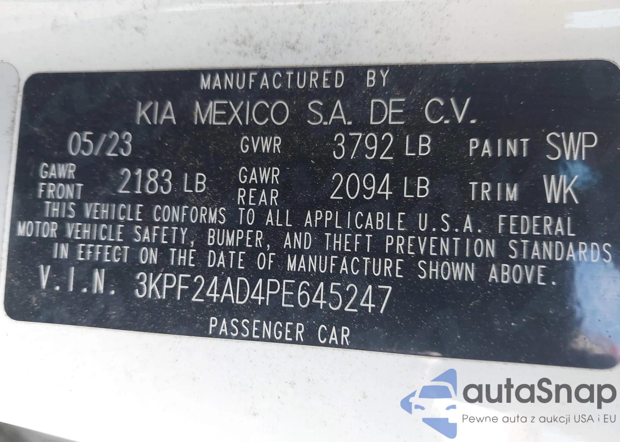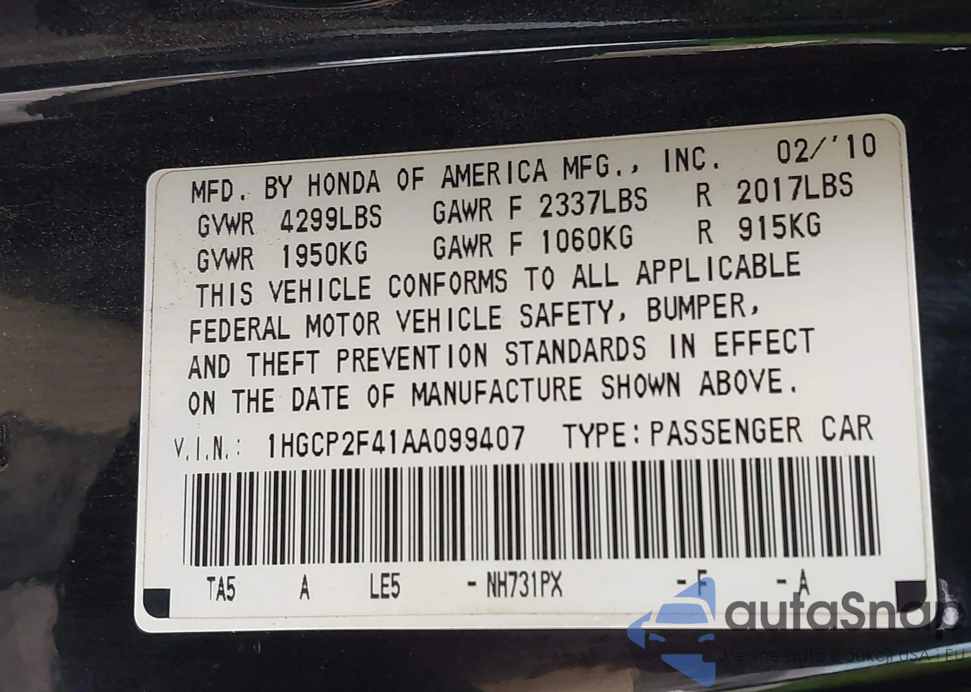 LOT: 43237302 VIN: 1HGCP2F41AA099407