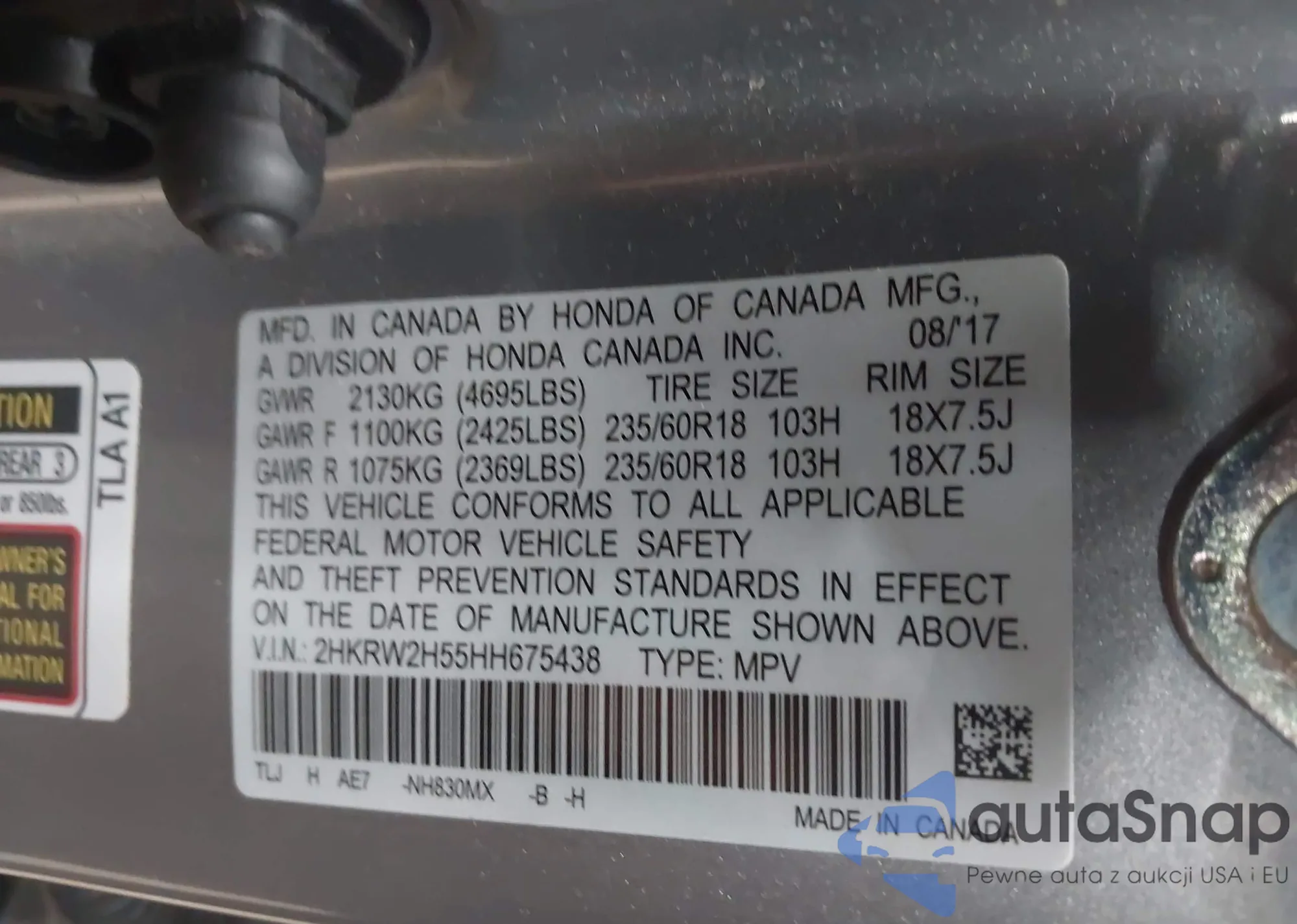 • VIN 2HKRW2H55HH675438