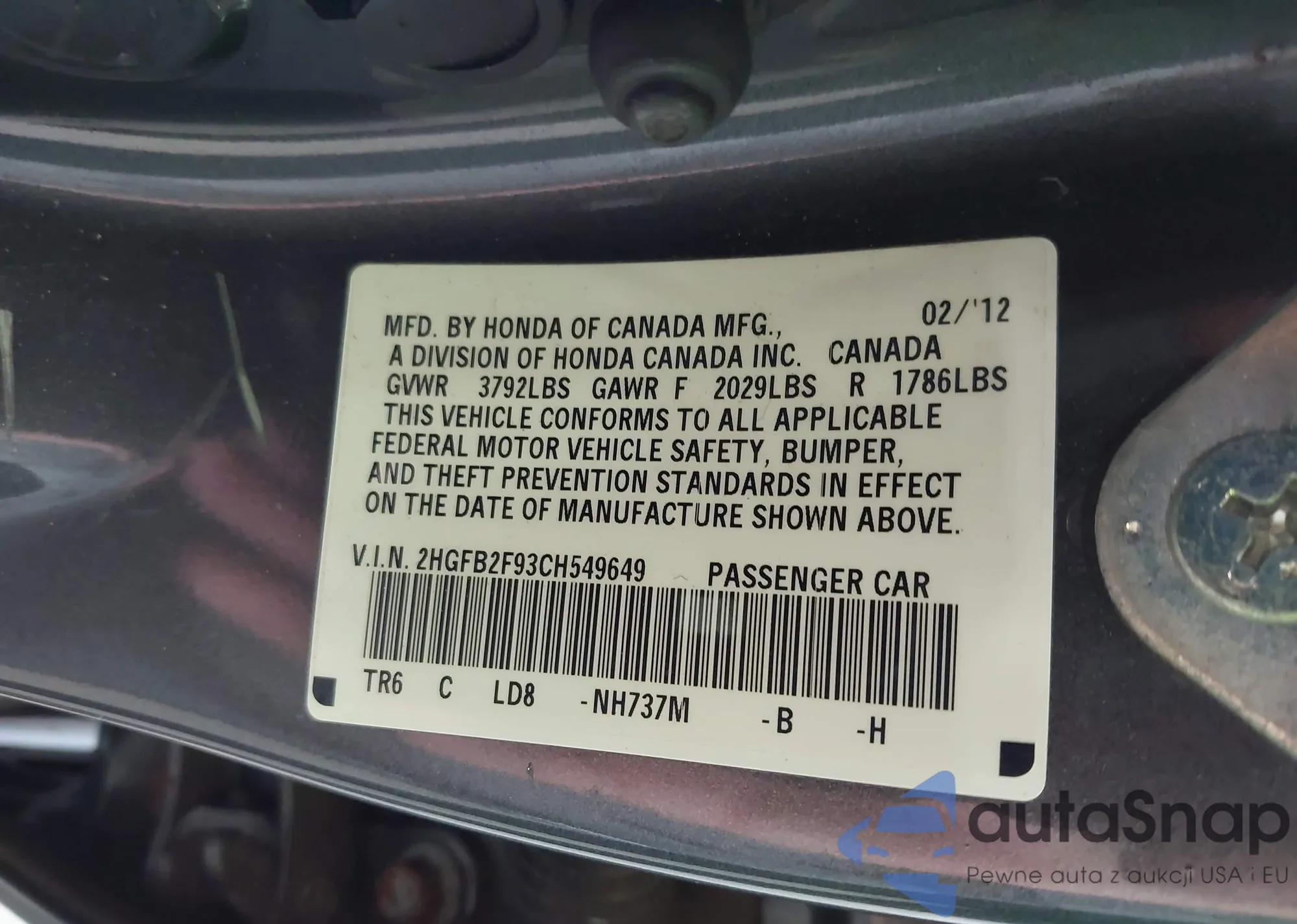 • VIN 2HGFB2F93CH549649