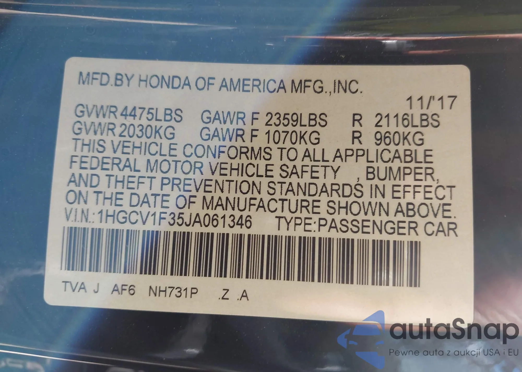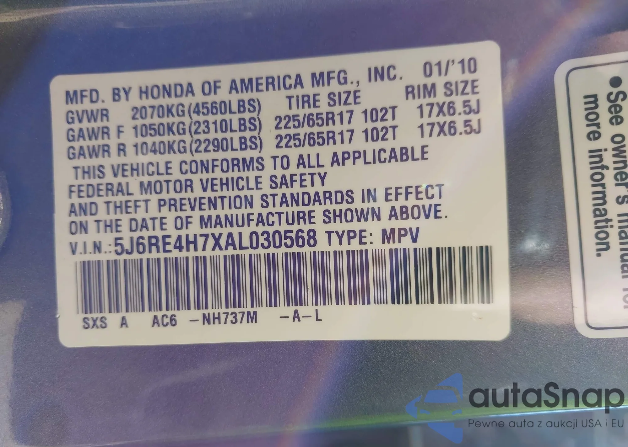 • VIN 5J6RE4H7XAL030568