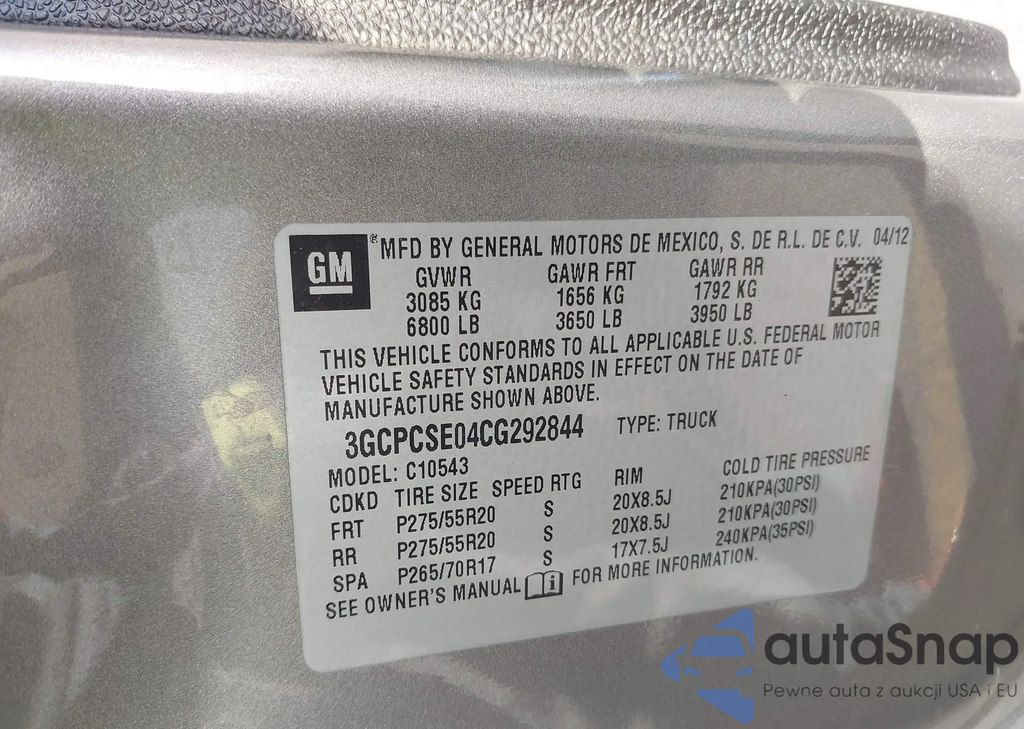 • VIN 3GCPCSE04CG292844