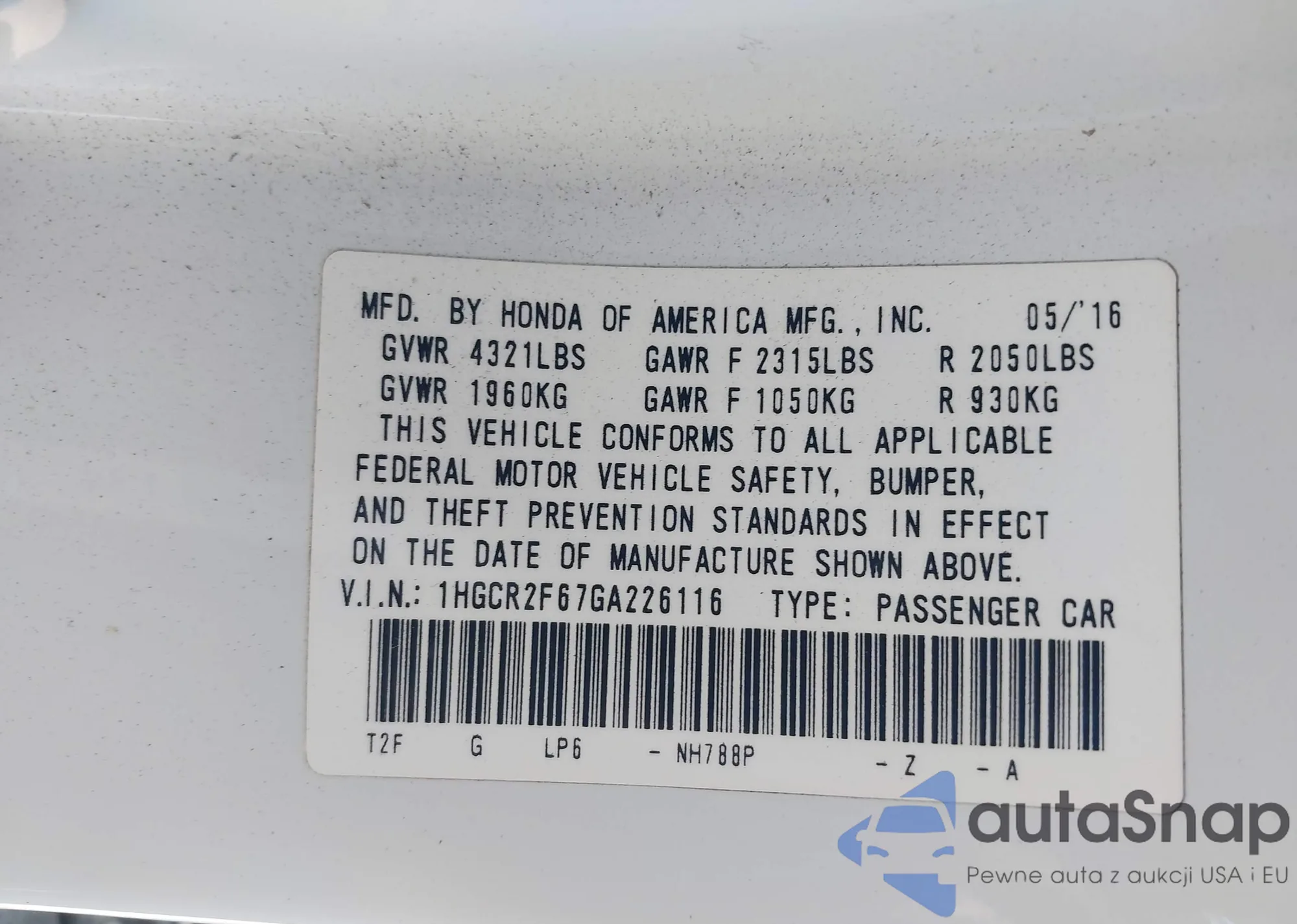 • VIN 1HGCR2F67GA226116
