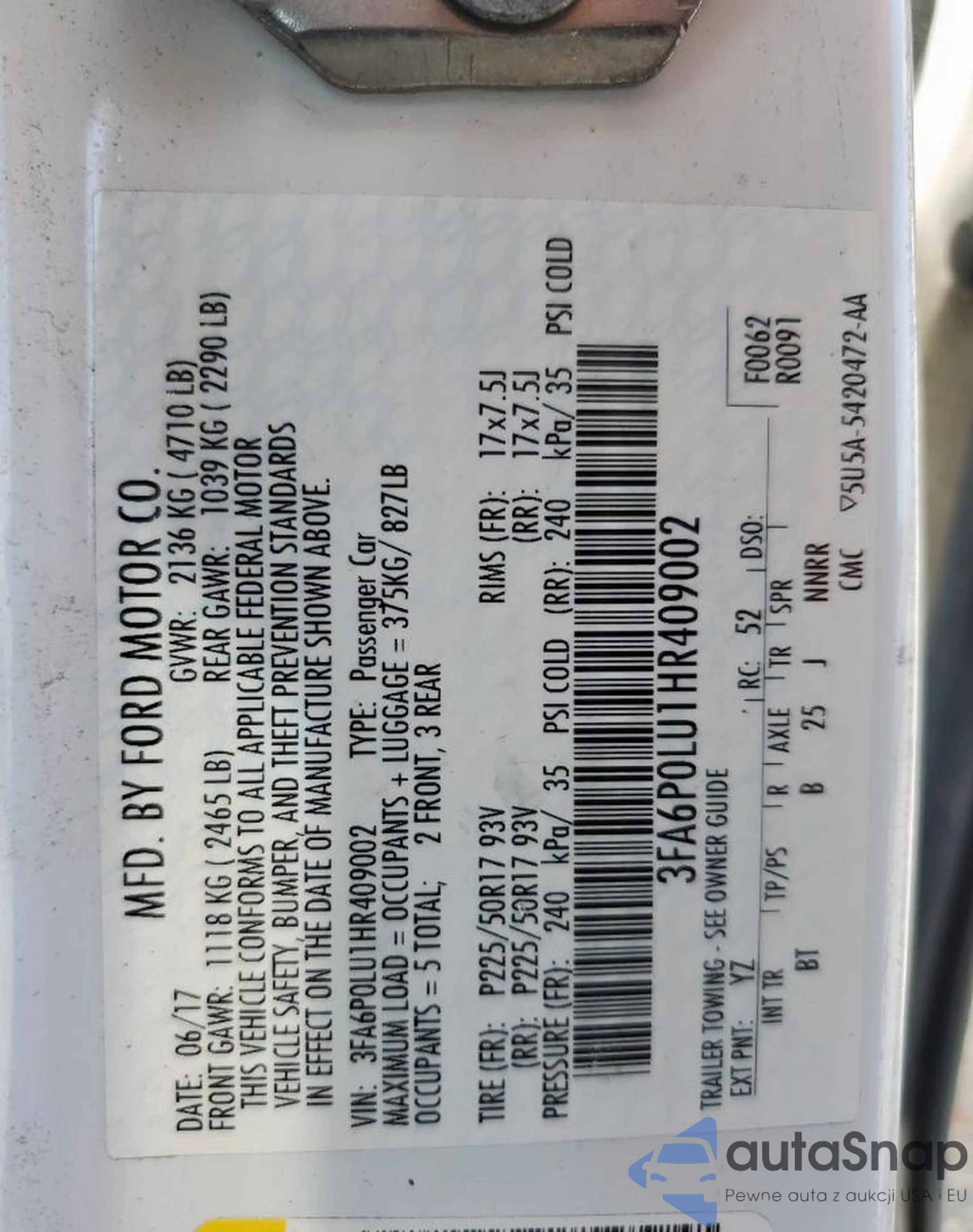 LOT: 54039005 VIN: 3FA6P0LU5HR409553