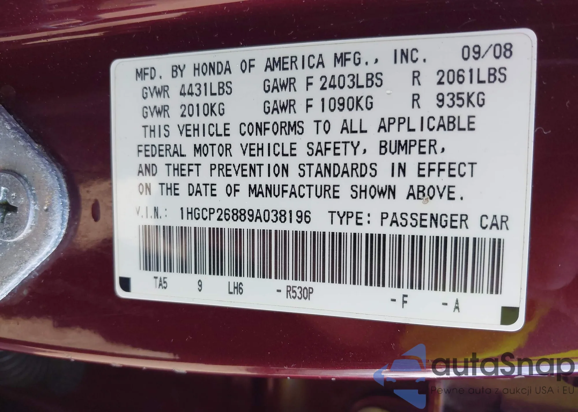 • VIN 2HKRS4H45PH406689