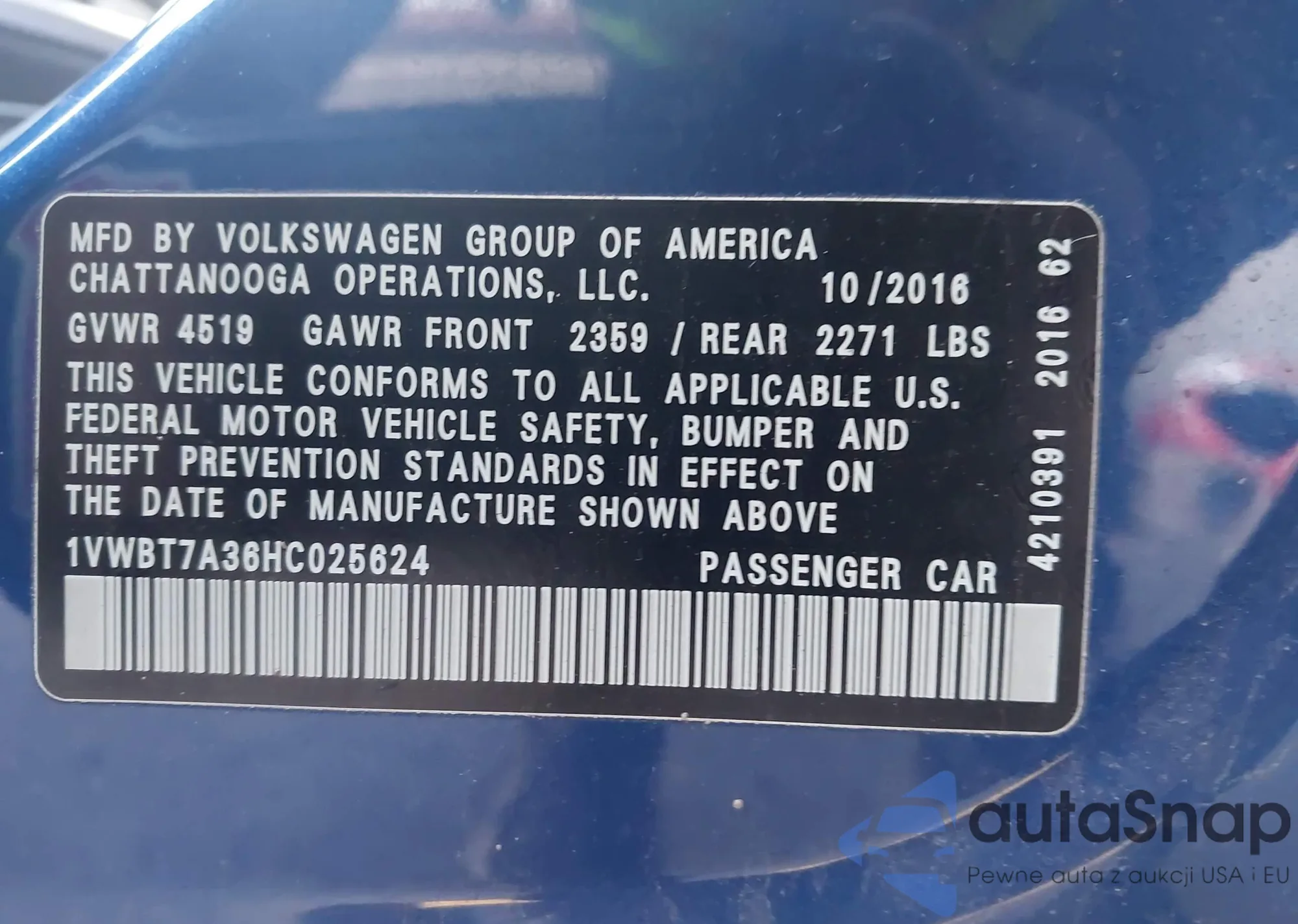 LOT: 43178210 VIN: 1VWAT7A3XGC056434