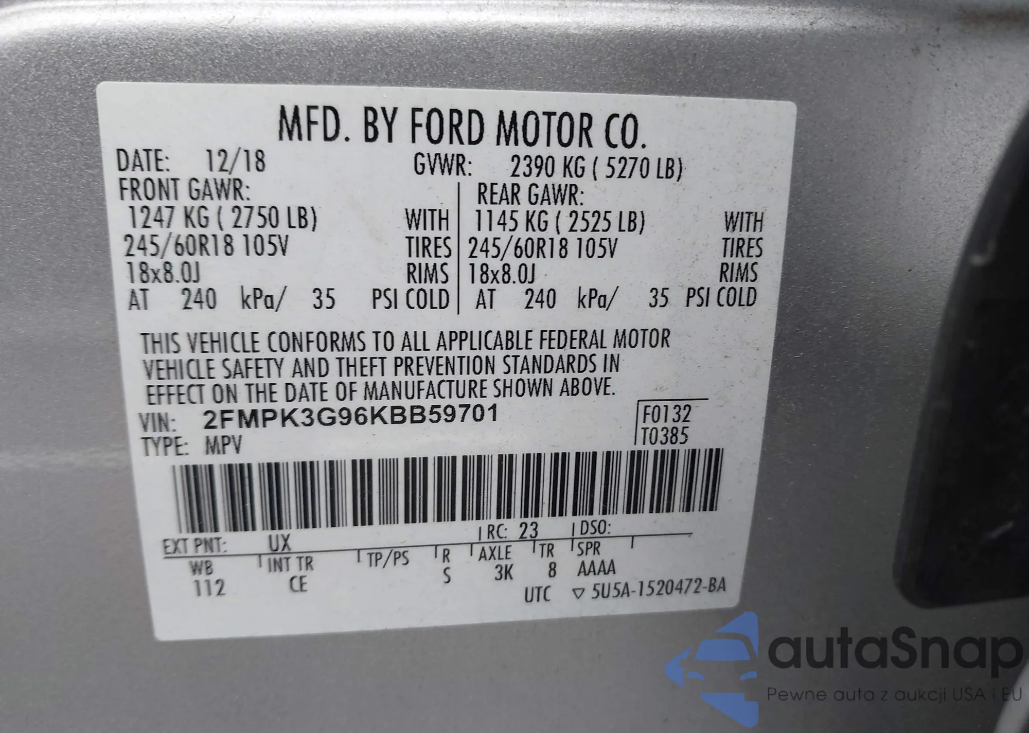 LOT: 43231527 VIN: 2FMPK3G96KBB59701