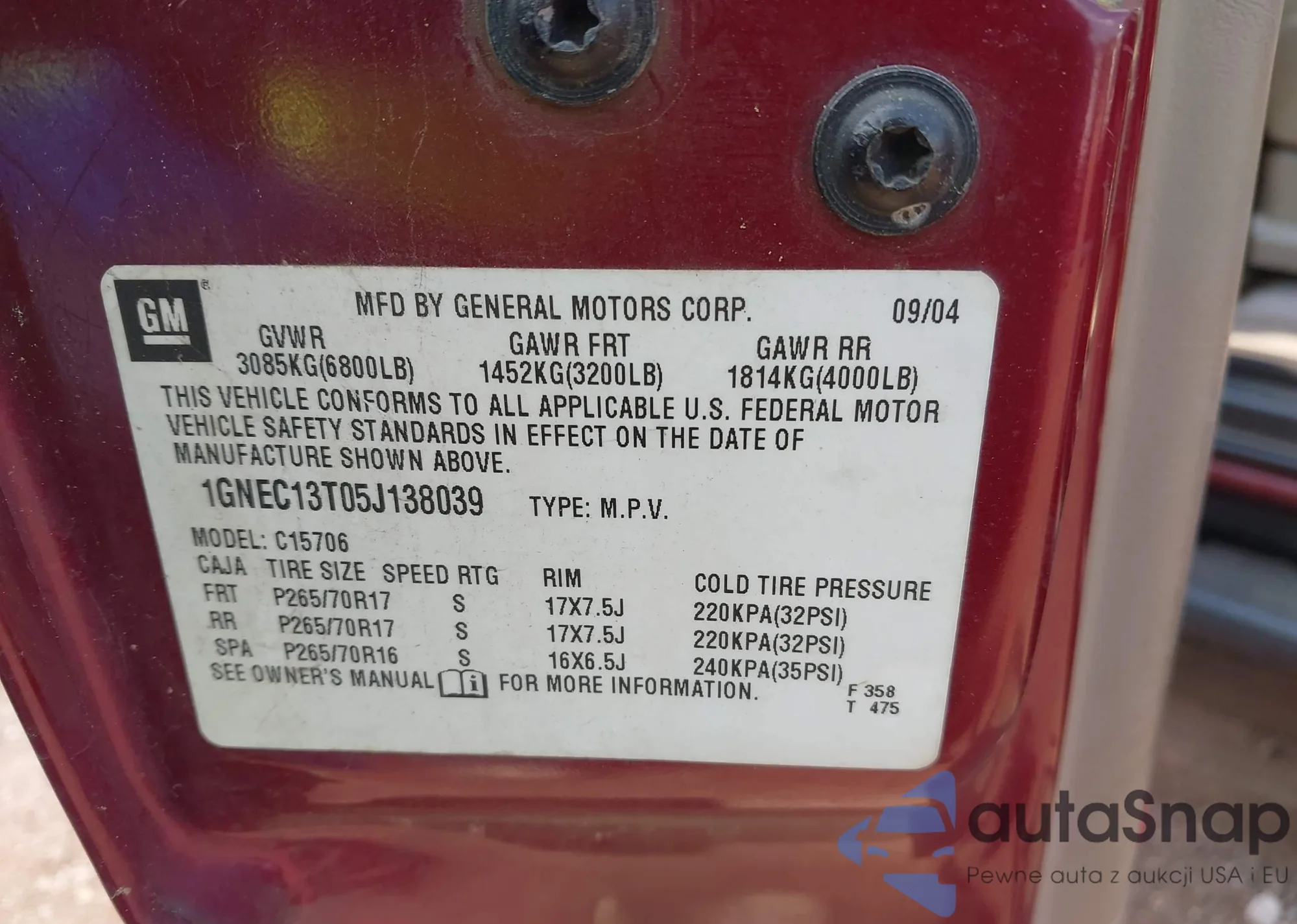 • VIN 1GNEC13T05J138039