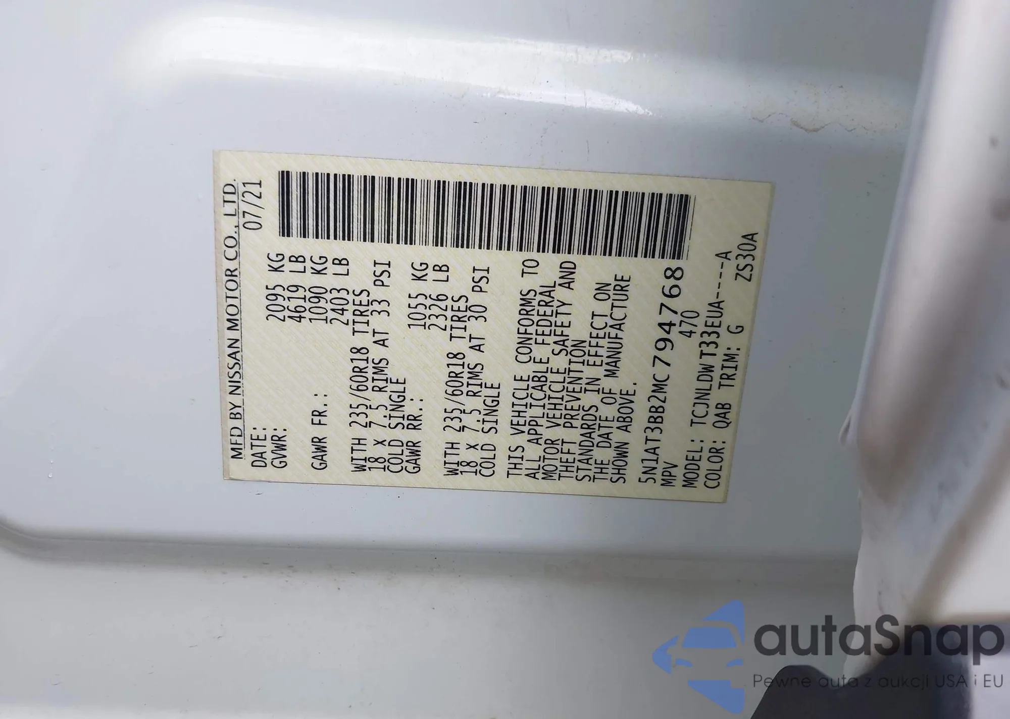 LOT: 43007695 VIN: 5N1AT3BB2MC794768