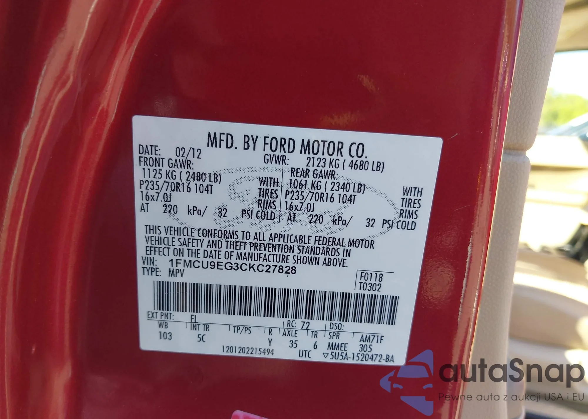LOT: 43216866 VIN: 1FMCU9EG3CKC27828