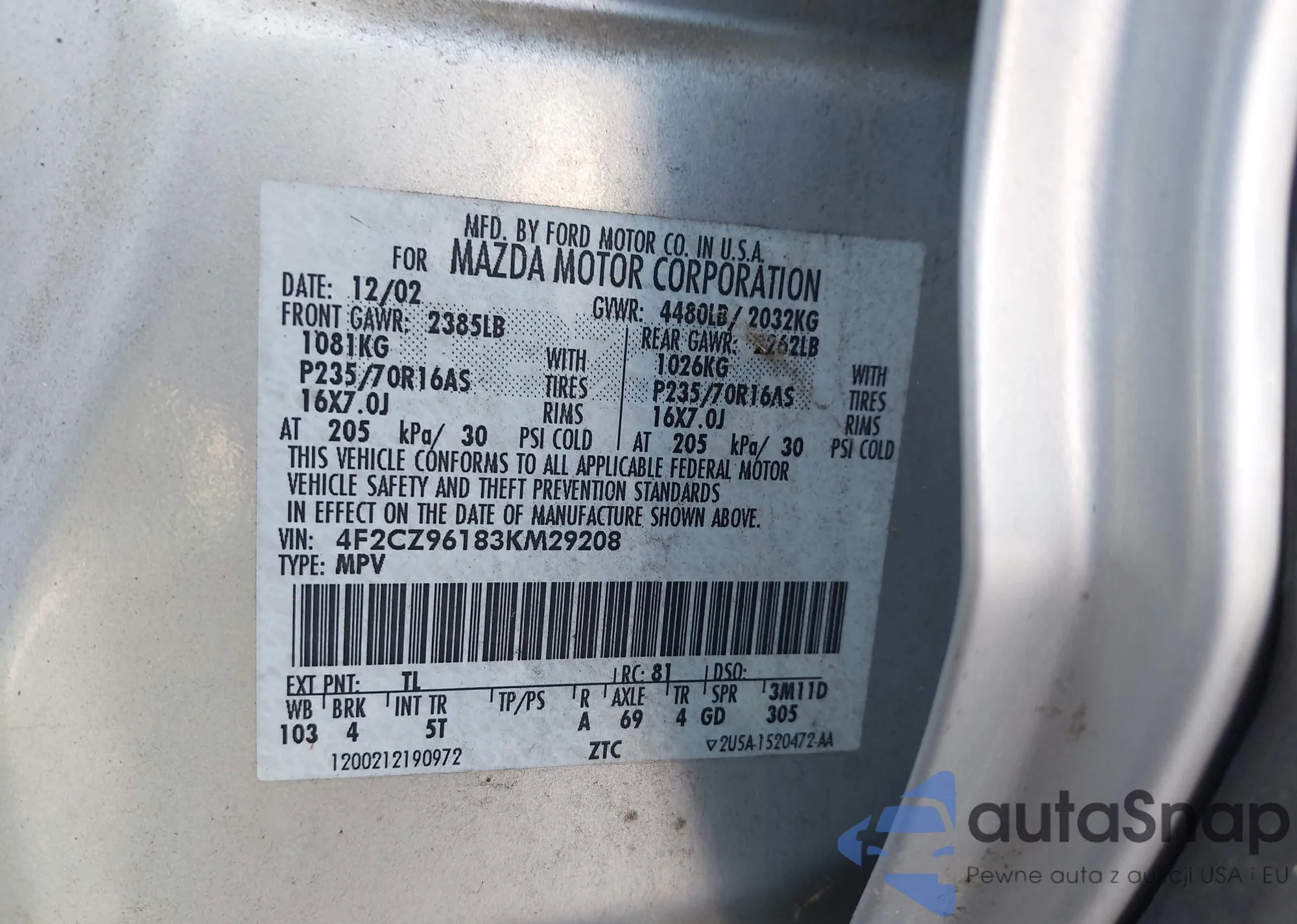 LOT: 42655960 VIN: 4F2CZ96183KM29208