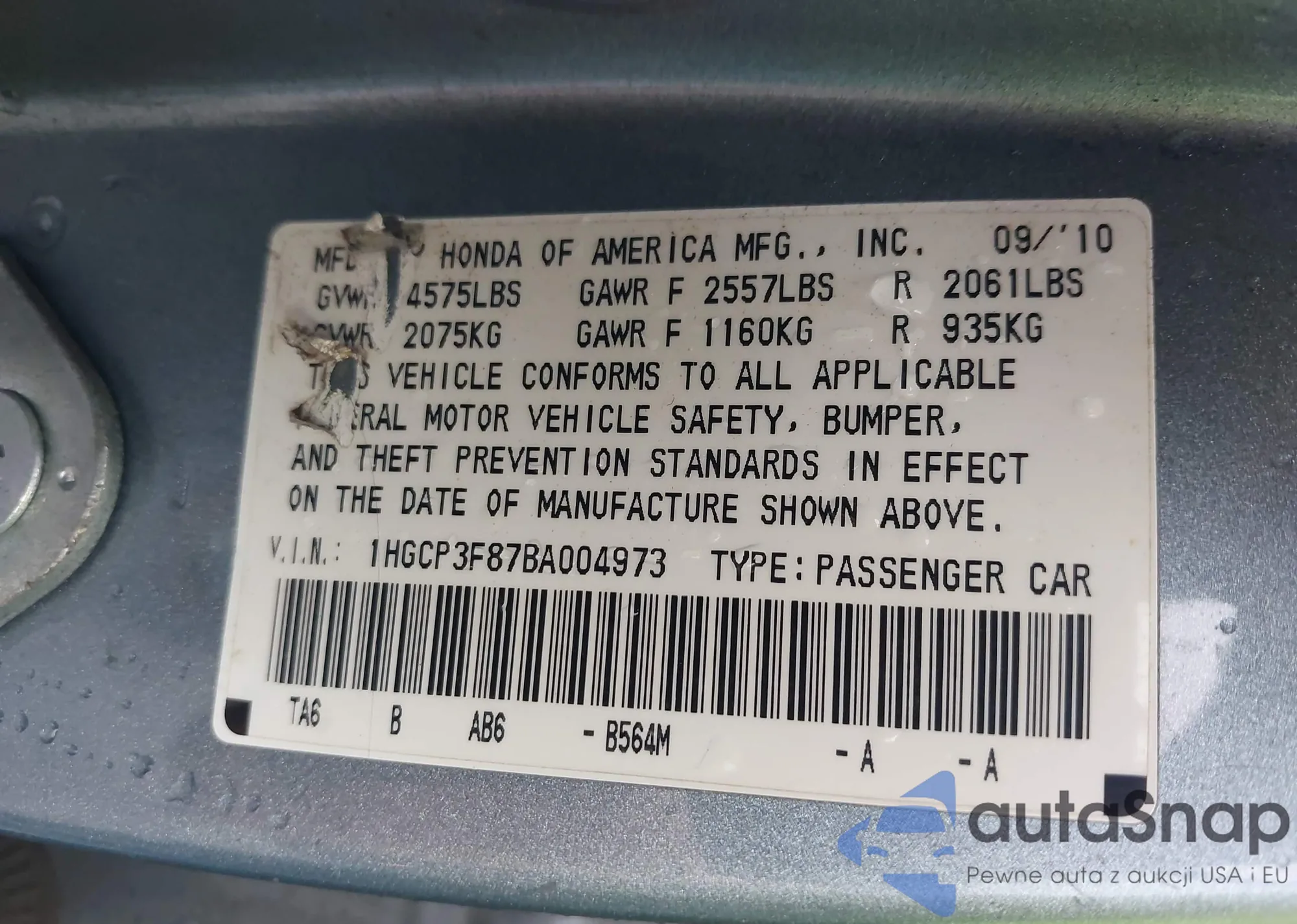 LOT: 43262373 VIN: 1HGCP3F87BA004973