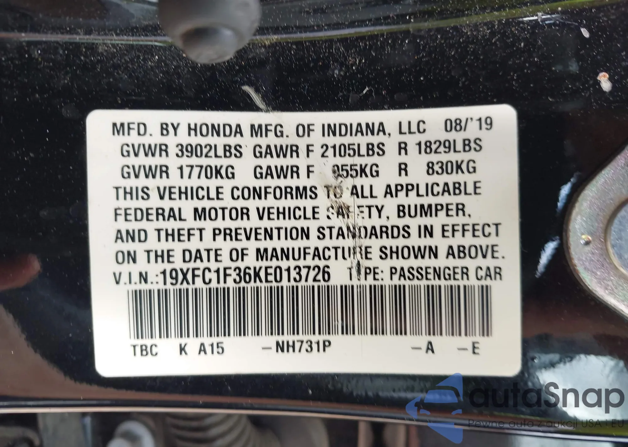 • VIN 19XFC1F36KE013726