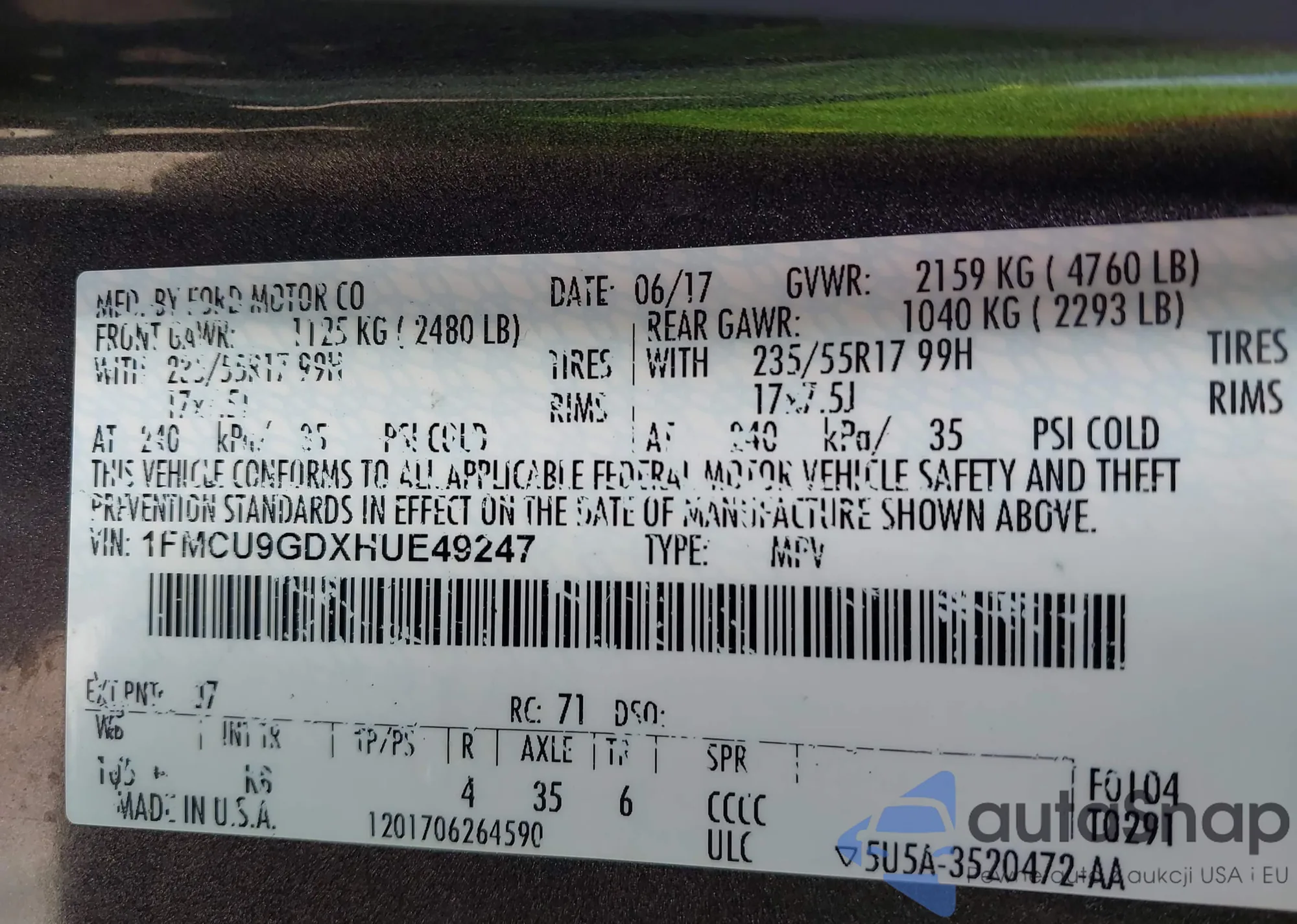 LOT: 43063382 VIN: 1FMCU9GDXHUE49247