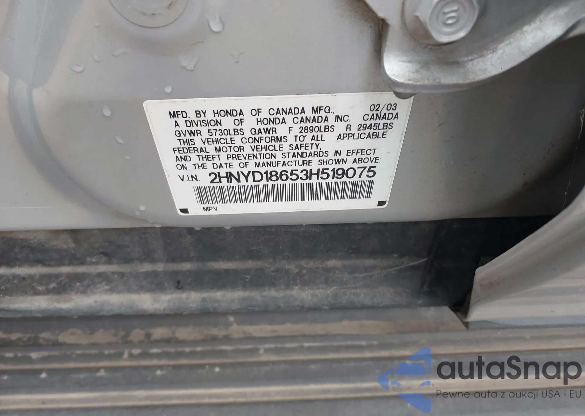 LOT: 43140295 VIN: 2HNYD18653H519075