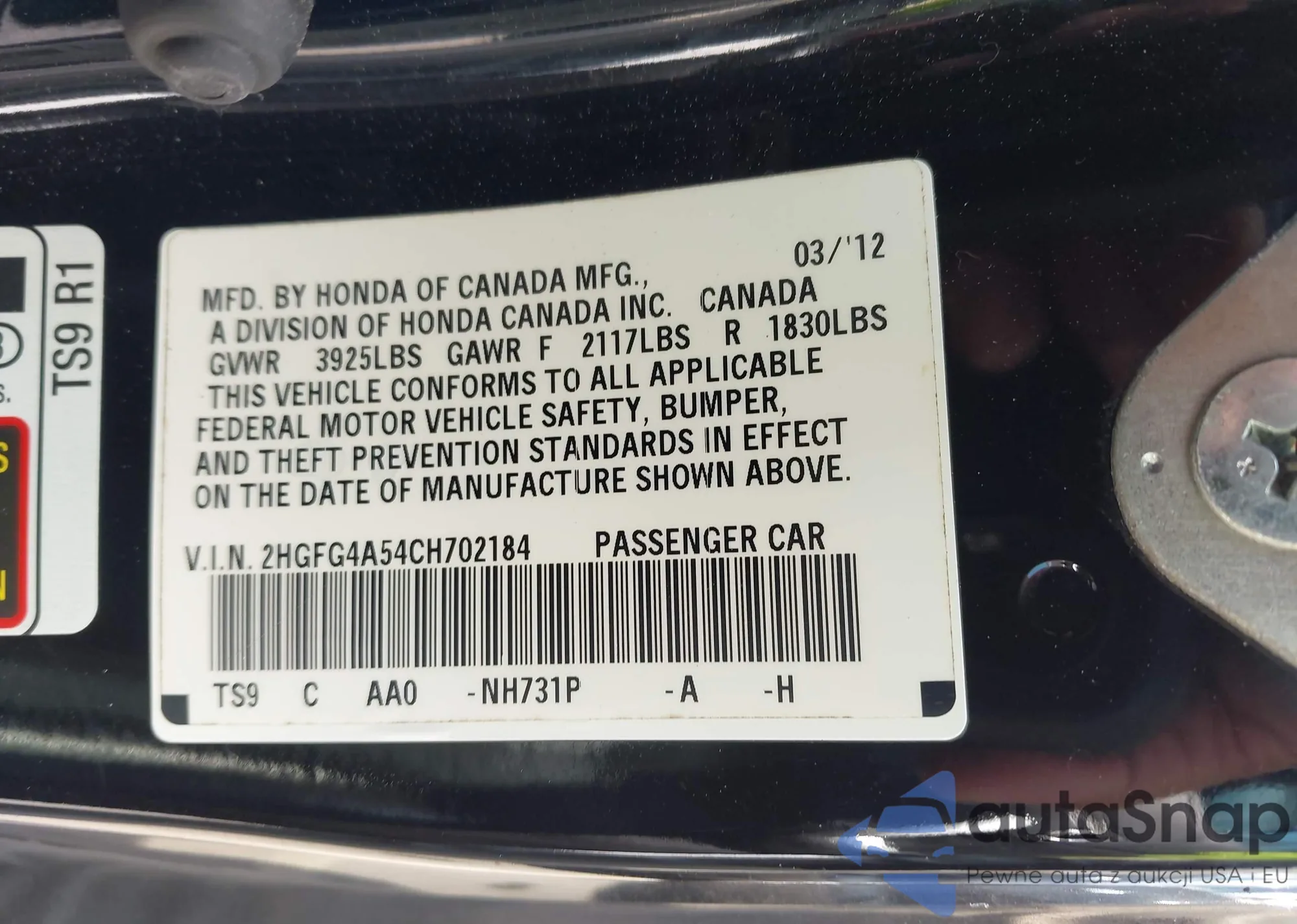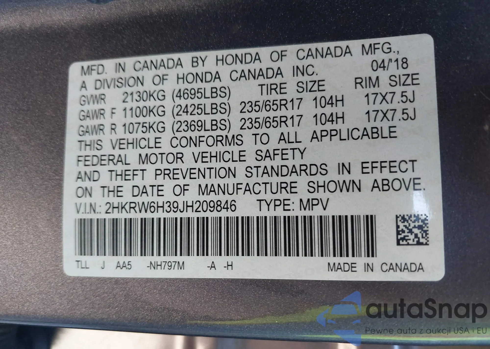 • VIN 2HKRW6H39JH209846