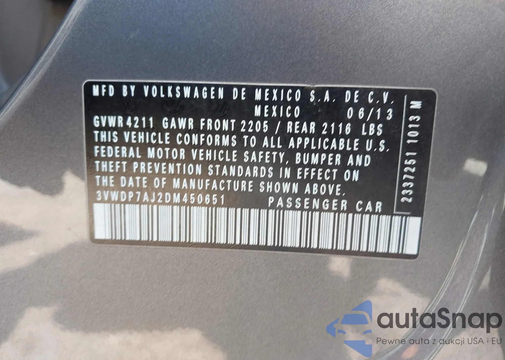 • VIN 3VWDP7AJ2DM450651