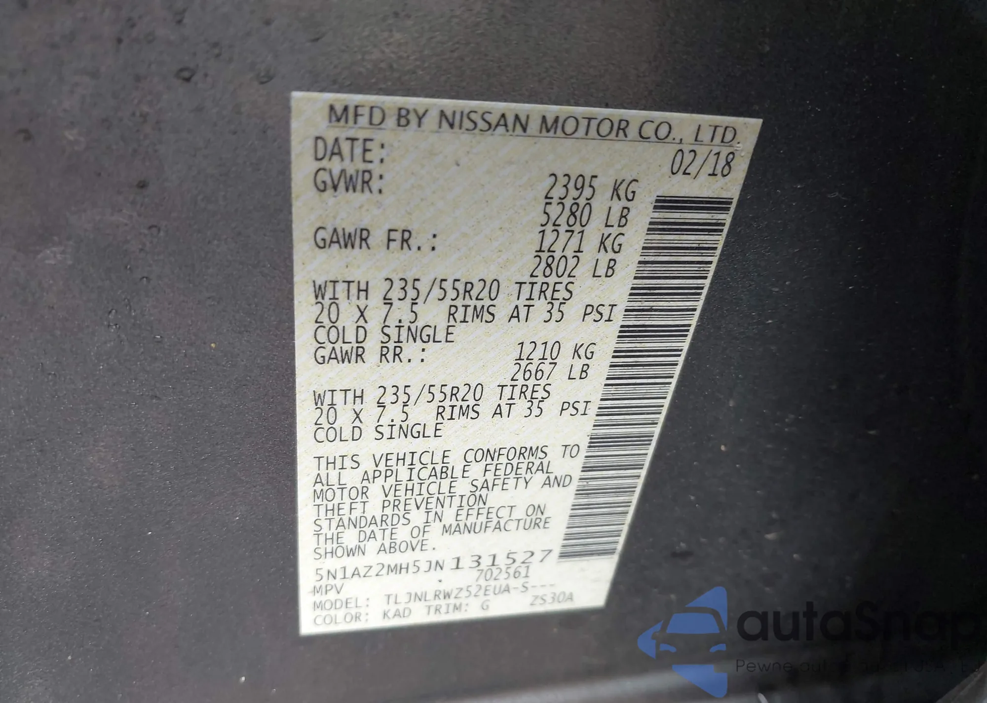 LOT: 43281663 VIN: 5N1AZ2MH5JN131527