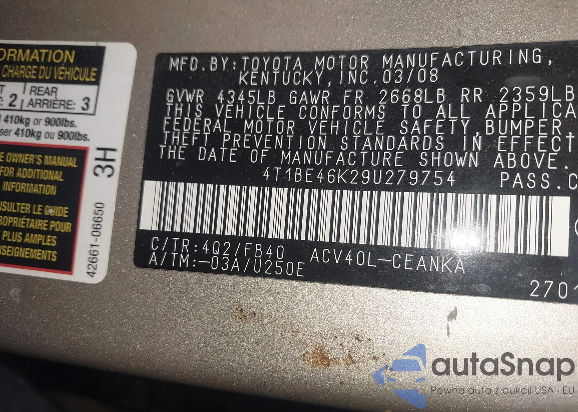 LOT: 43280330 VIN: 4T1BE46K29U279754