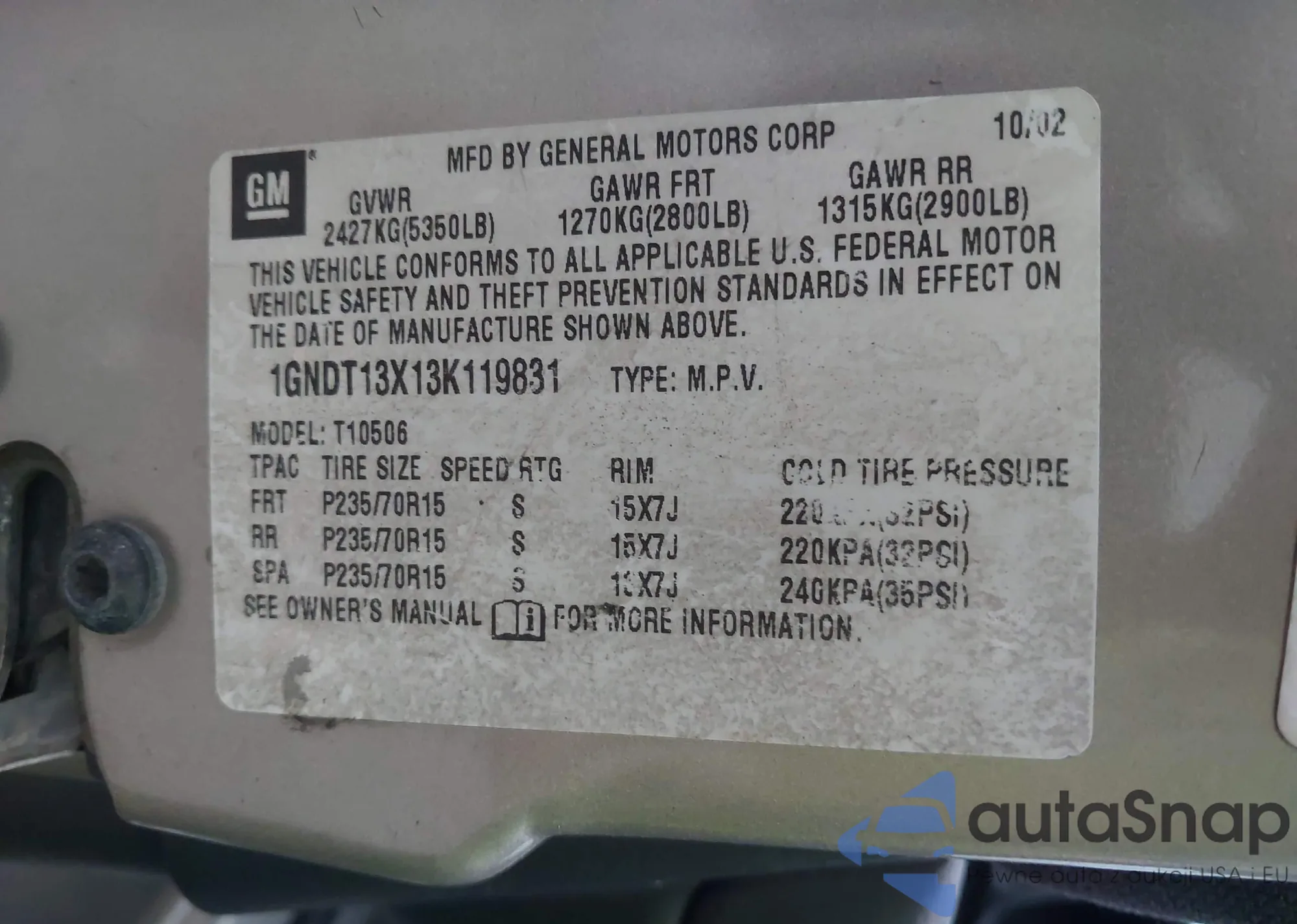 • VIN 1GNDT13X13K119831