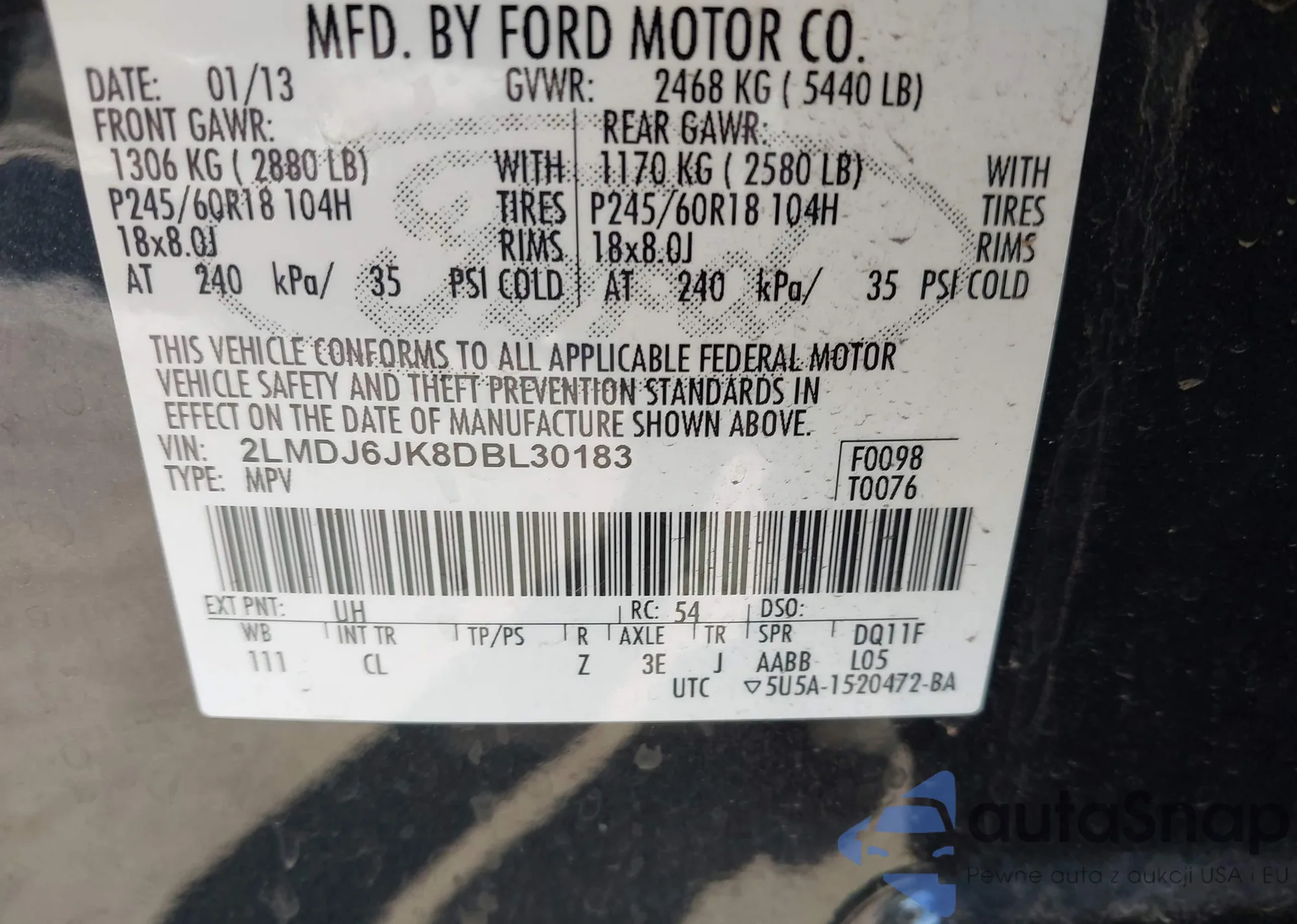 LOT: 43305322 VIN: 2LMDJ6JK8DBL30183