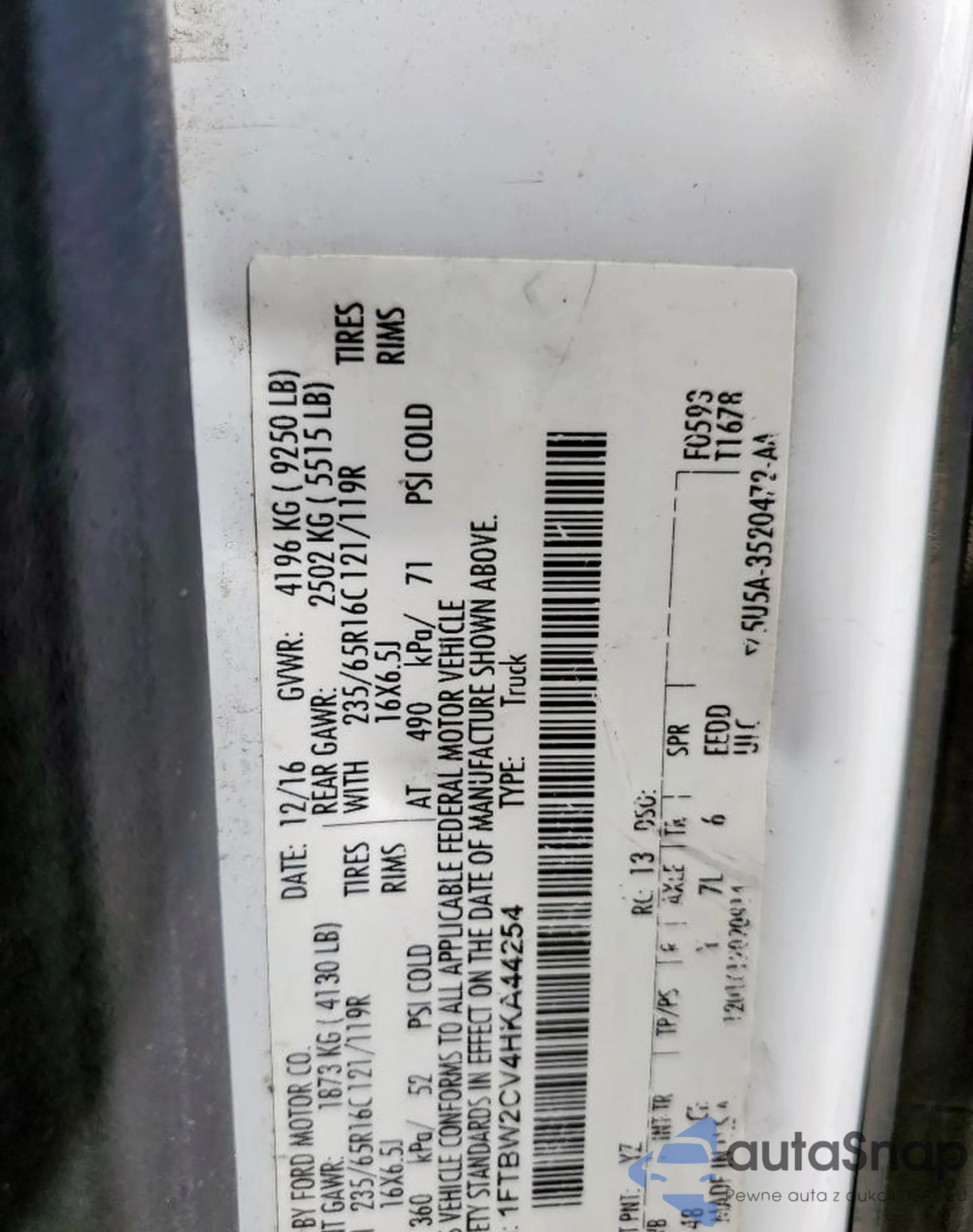 • VIN 1FTBW2CV4HKA44254